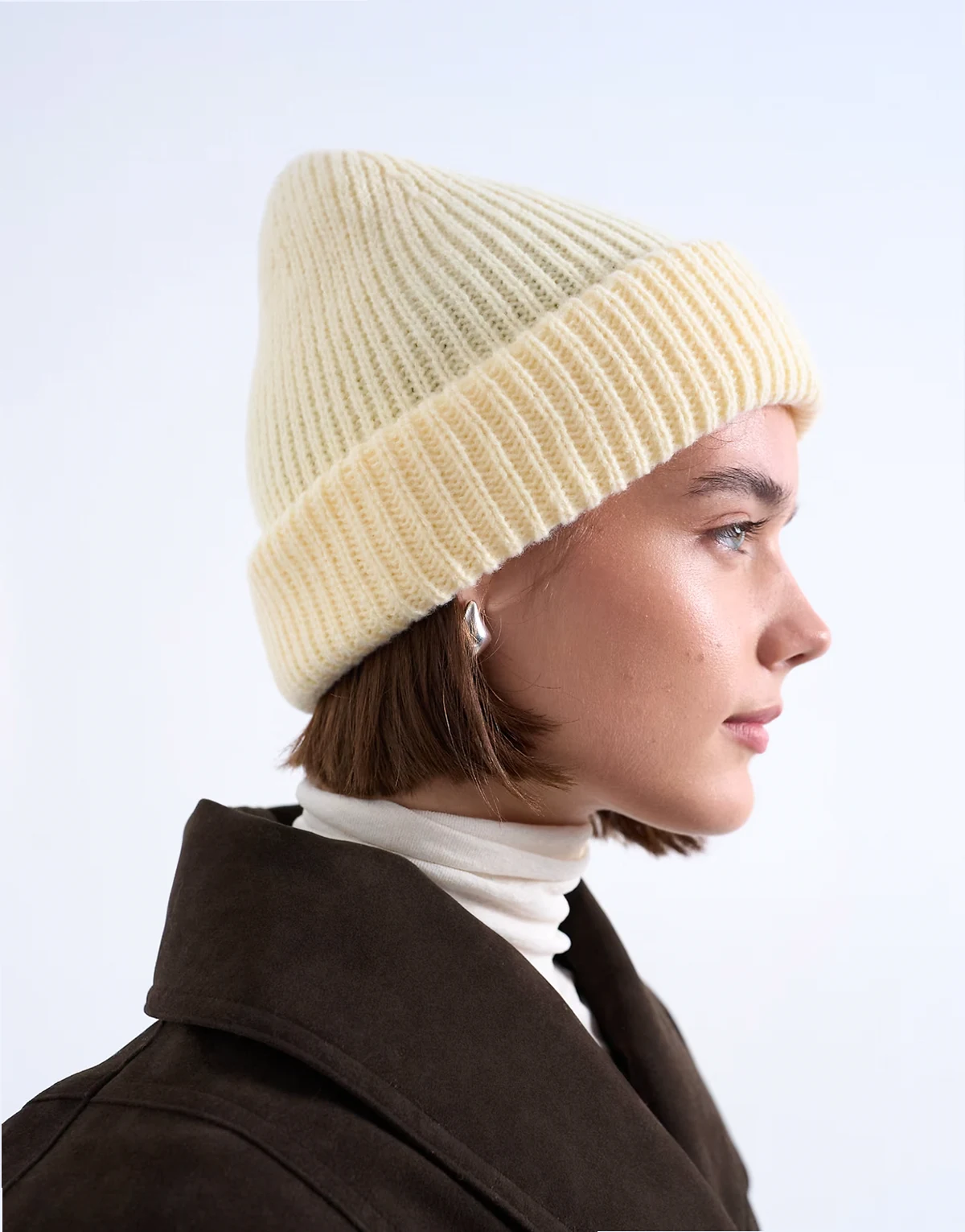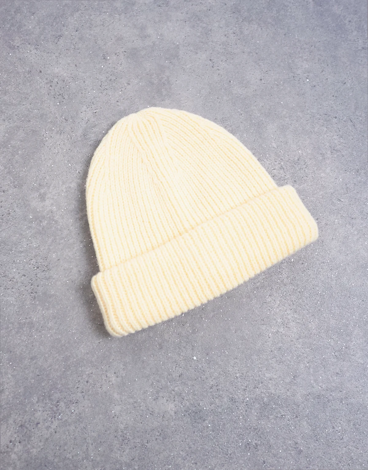 This beanie is crafted using a ribbed knit in a buttermilk yellow. Featuring a domed crown, it is complete with a turn-up brim and is ideal for the winter months.
