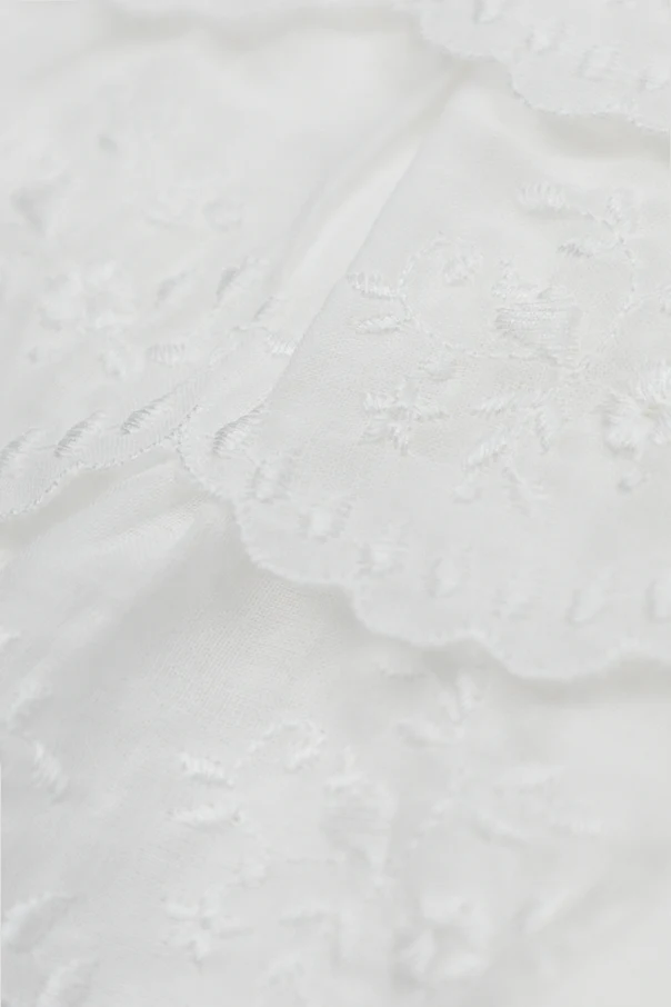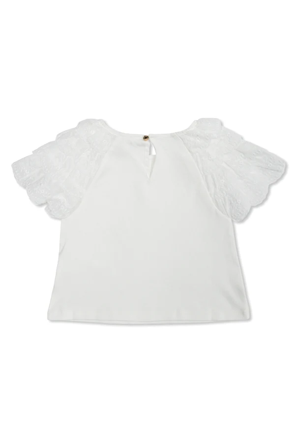 Indulge in understated elegance with this exquisite white turtleneck top from Chloé Kids , thoughtfully crafted for those who appreciate sophistication in every detail. The classic, gently flared silhouette offers timeless appeal, elevated by delicately embroidered short sleeves adorned with a subtle floral motif and scalloped, lace-like edges.