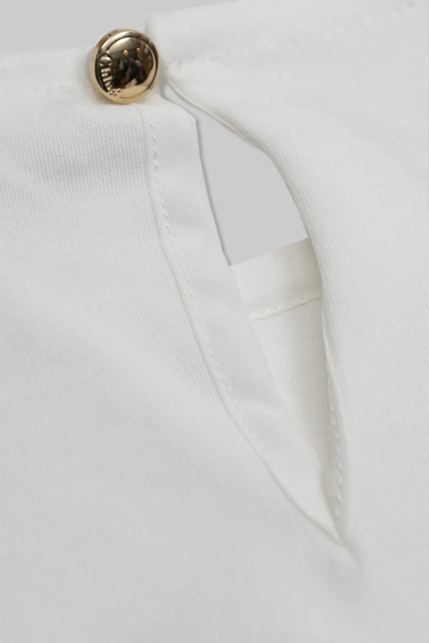 The smooth, premium cotton body ensures unparalleled comfort, while the airy, intricate sleeves add an ethereal, feminine touch. A refined back slit fastens with a lustrous, gold-tone ornamental button, hinting at the brand's discreet luxury.