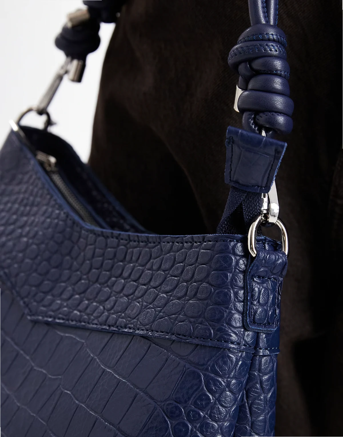 v top shoulder bag with crossbody strap in navy croc