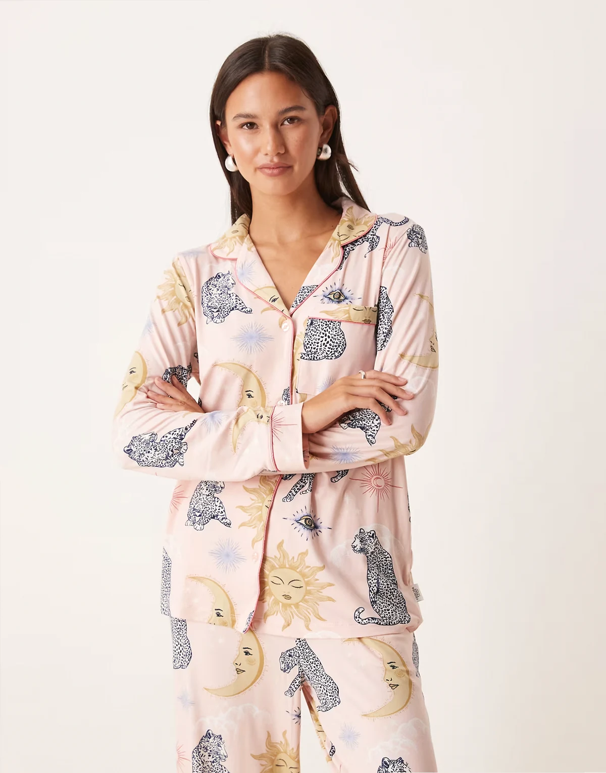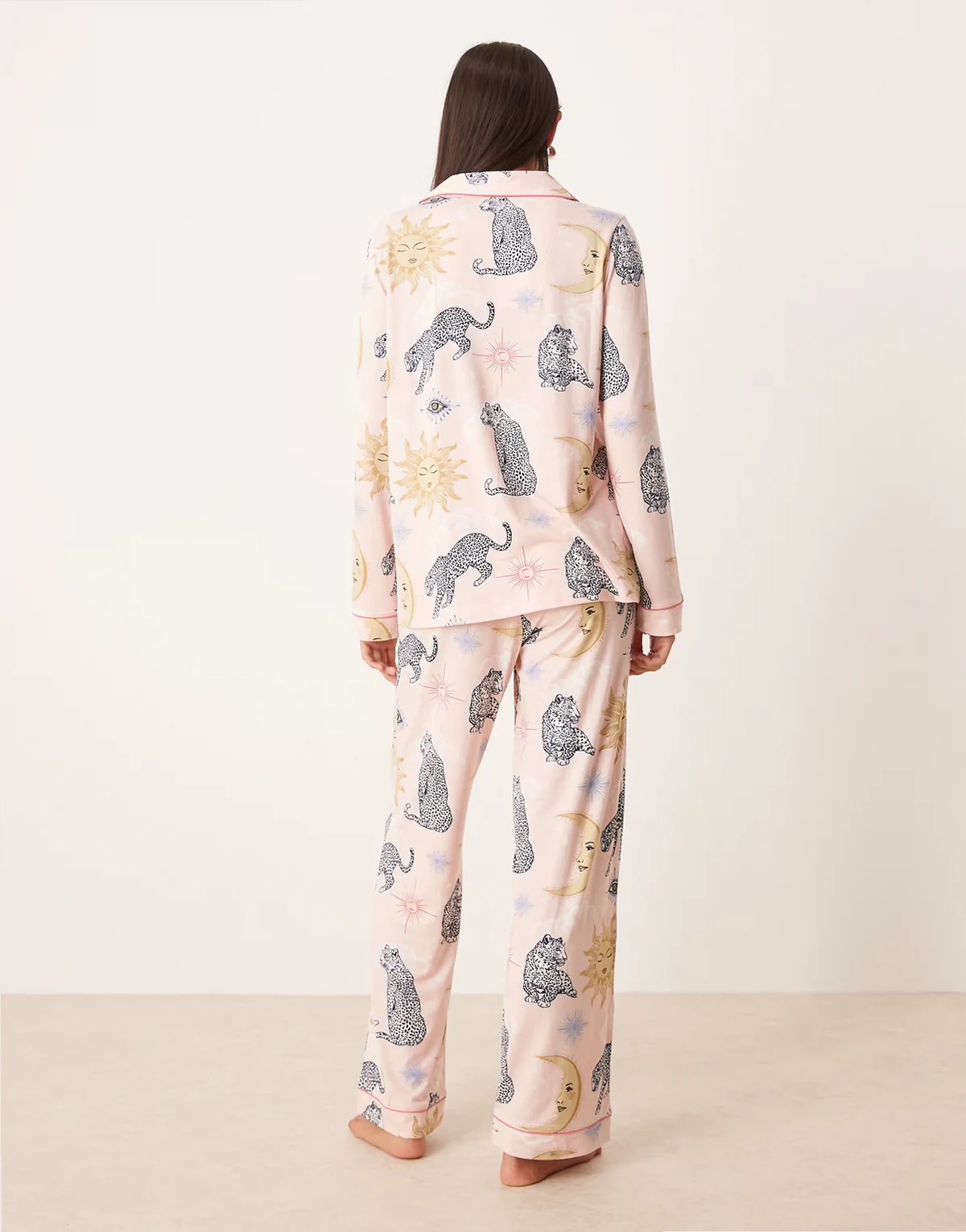poly long sleeve camp collar pajama set in celestial tiger print