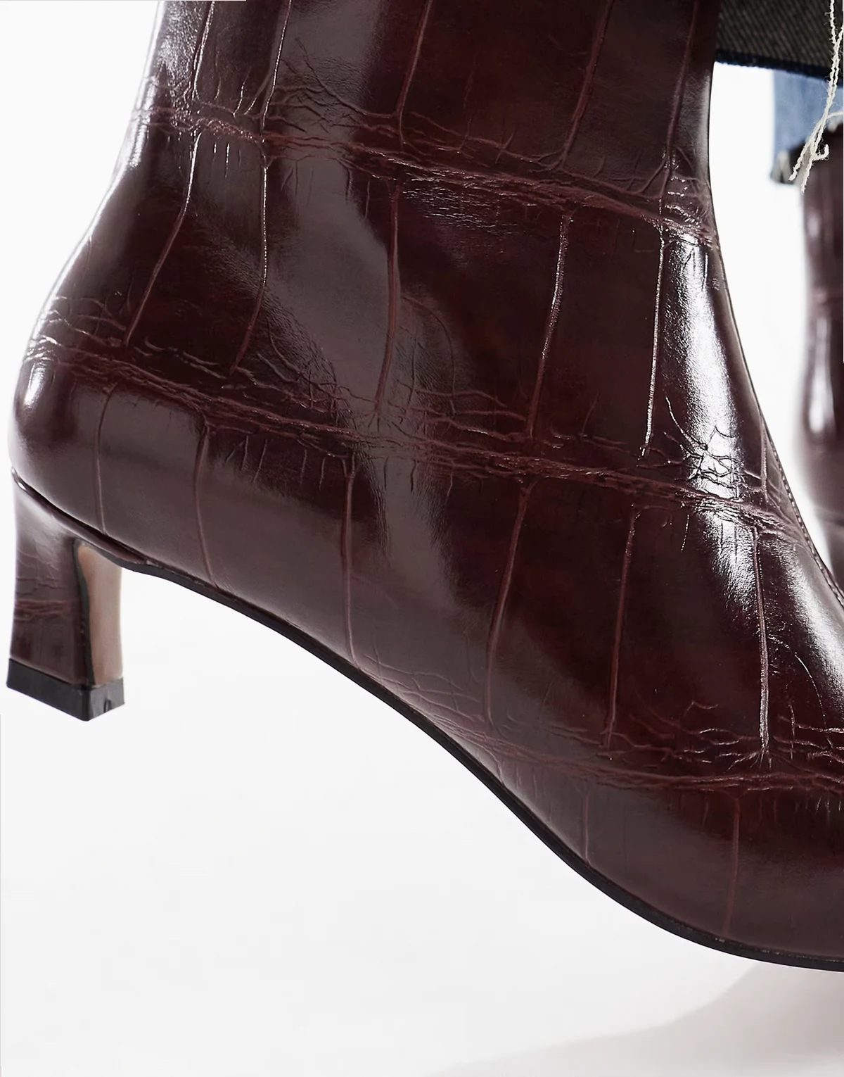 Bexley pointed toe kitten heel ankle boots in burgundy croc