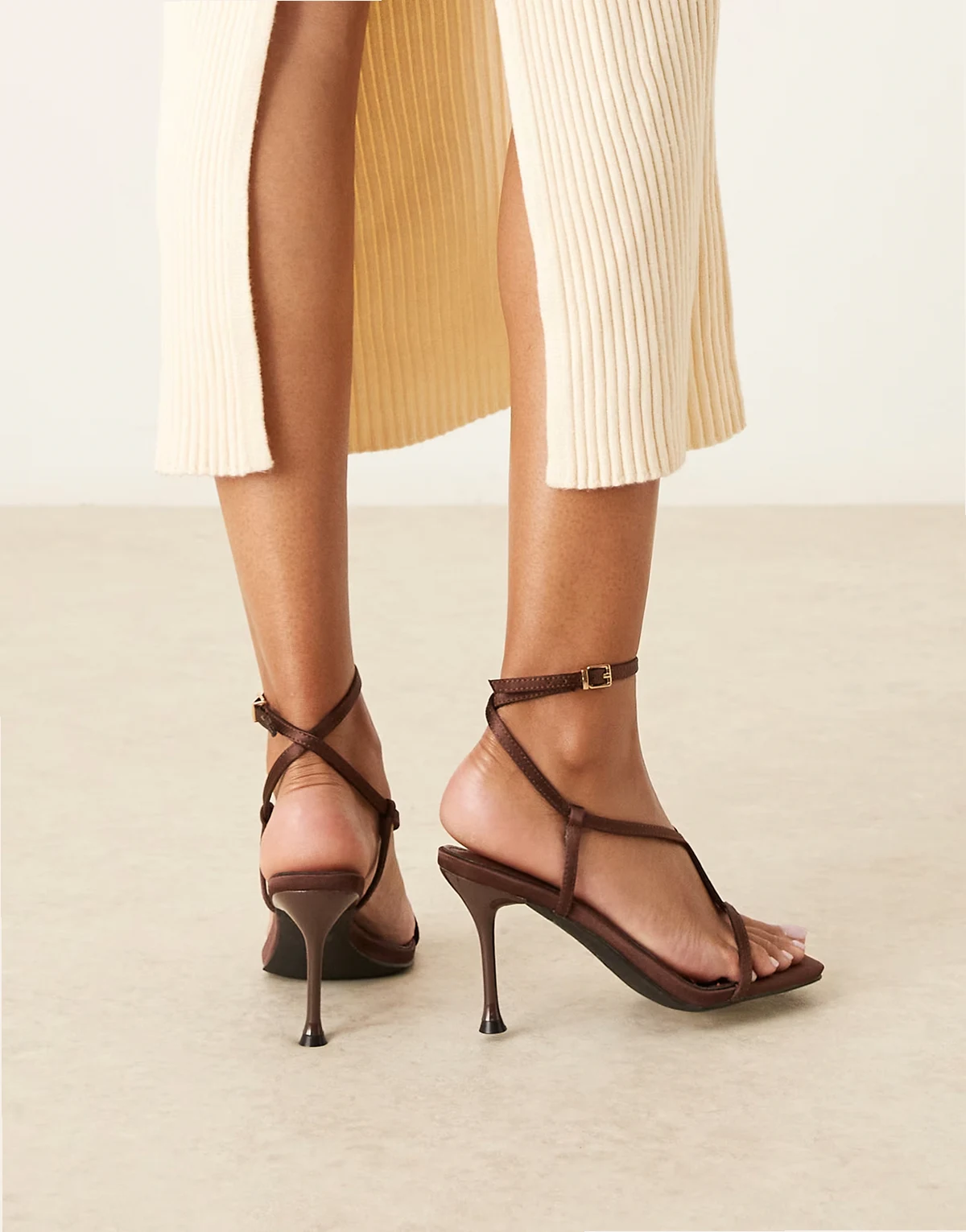 strappy heeled sandals in brown satin