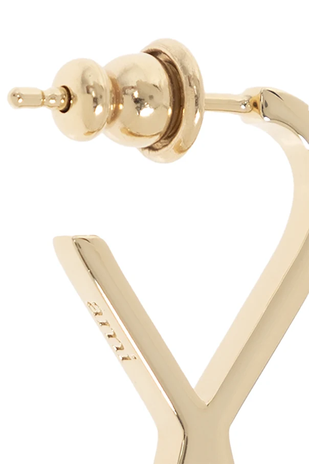 One of the arms of the "Y" features a delicate inscription that elegantly identifies the designer, adding a subtle touch of exclusivity to the piece. The stud closure, comprising a post and a secure backing, guarantees a comfortable and stable fit, making these earrings suitable for prolonged wear.