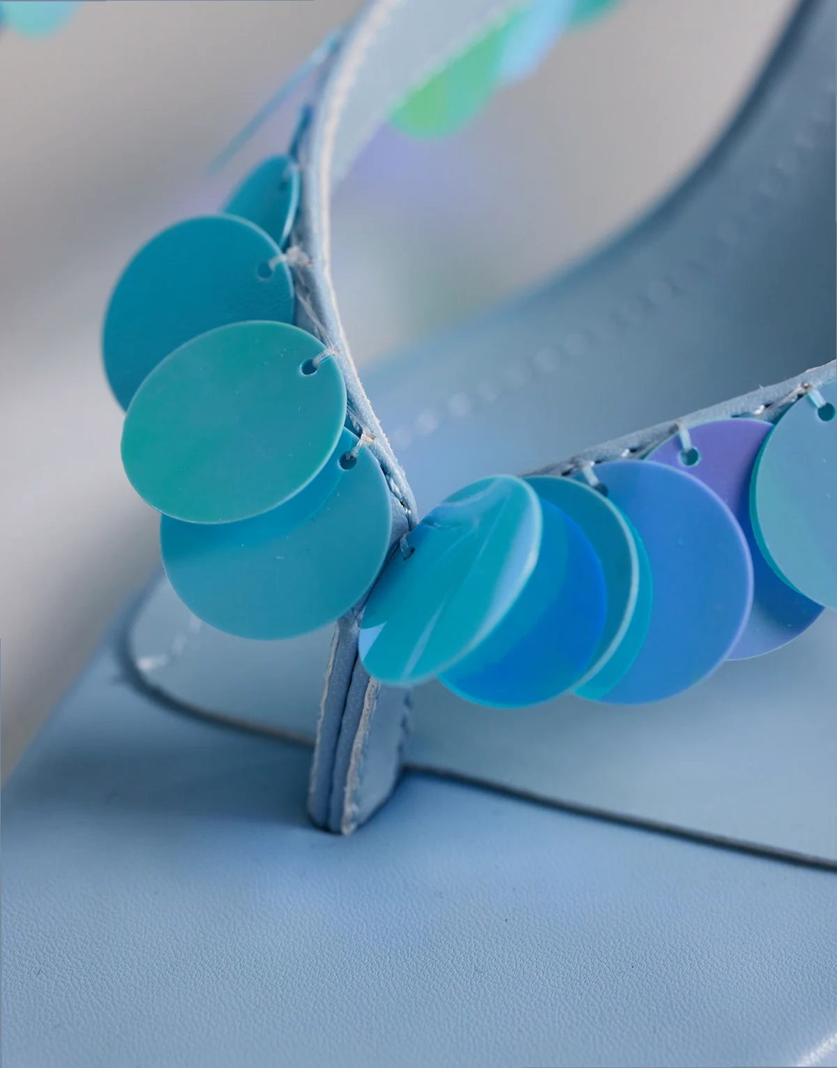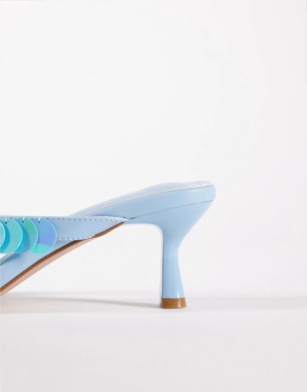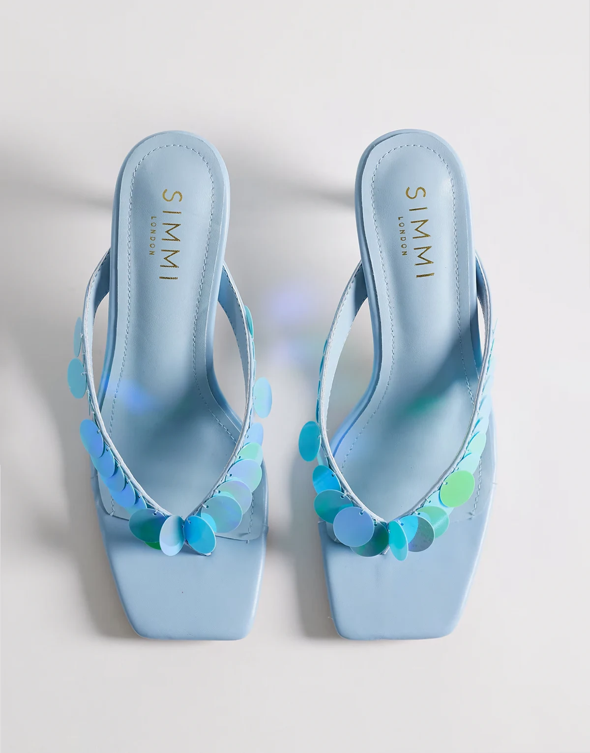 Simmi London Jenny kitten heel flip flop sandals with sequins in blue