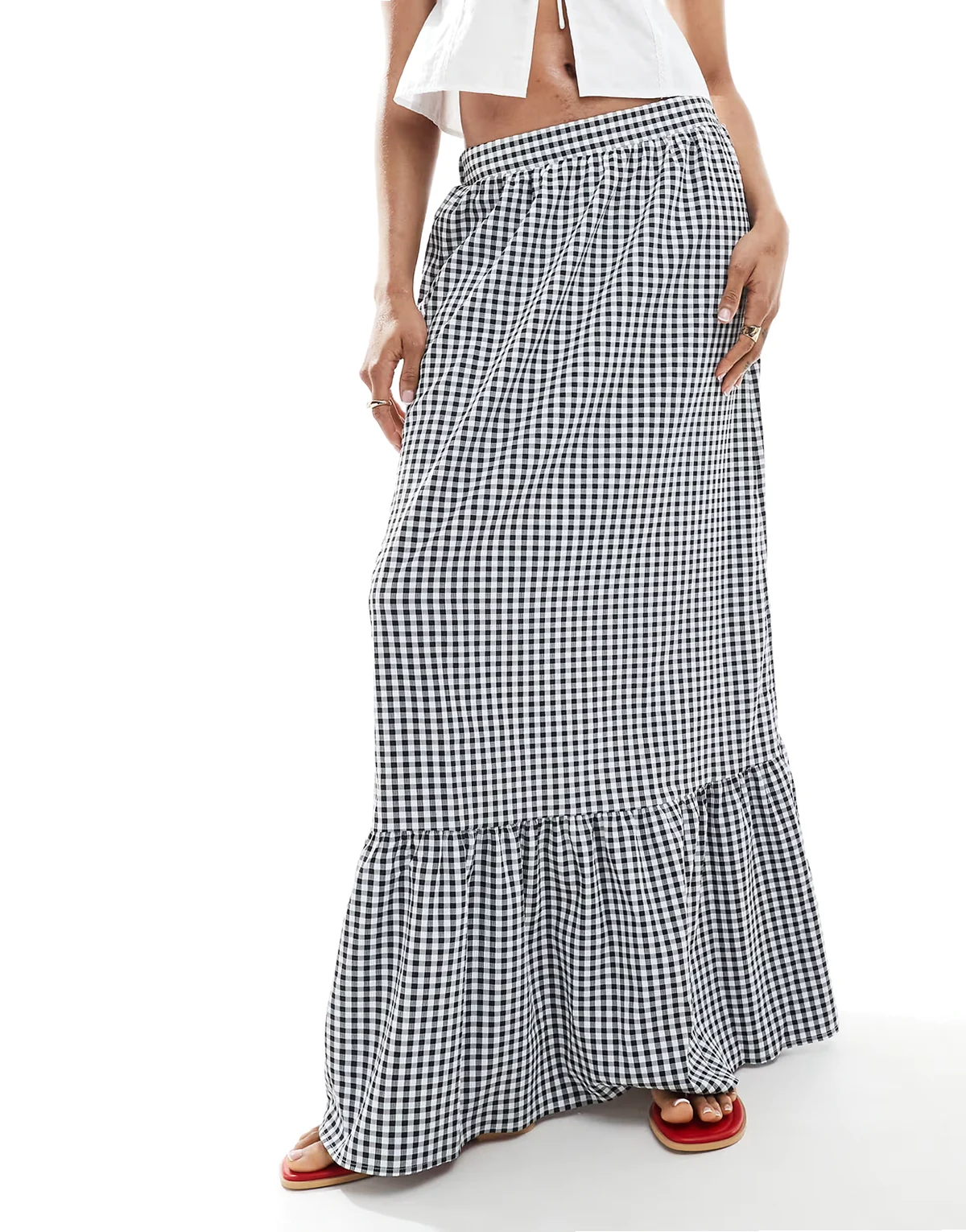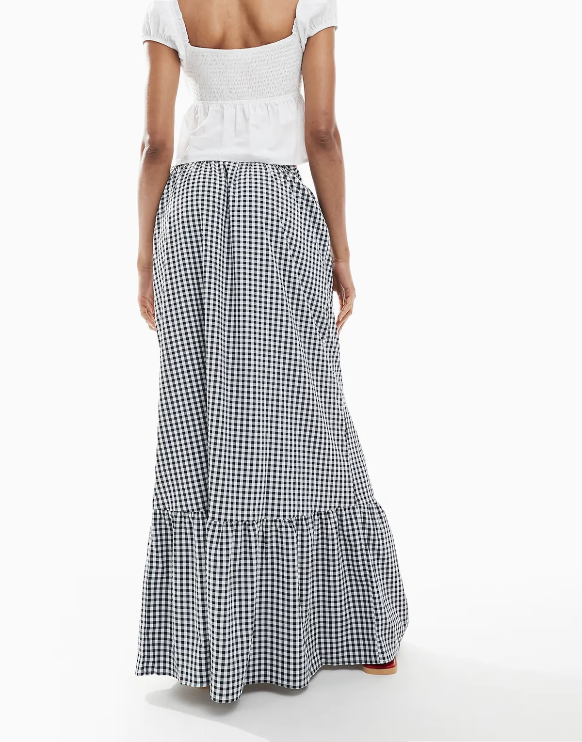 tiered hem maxi skirt in black gingham print