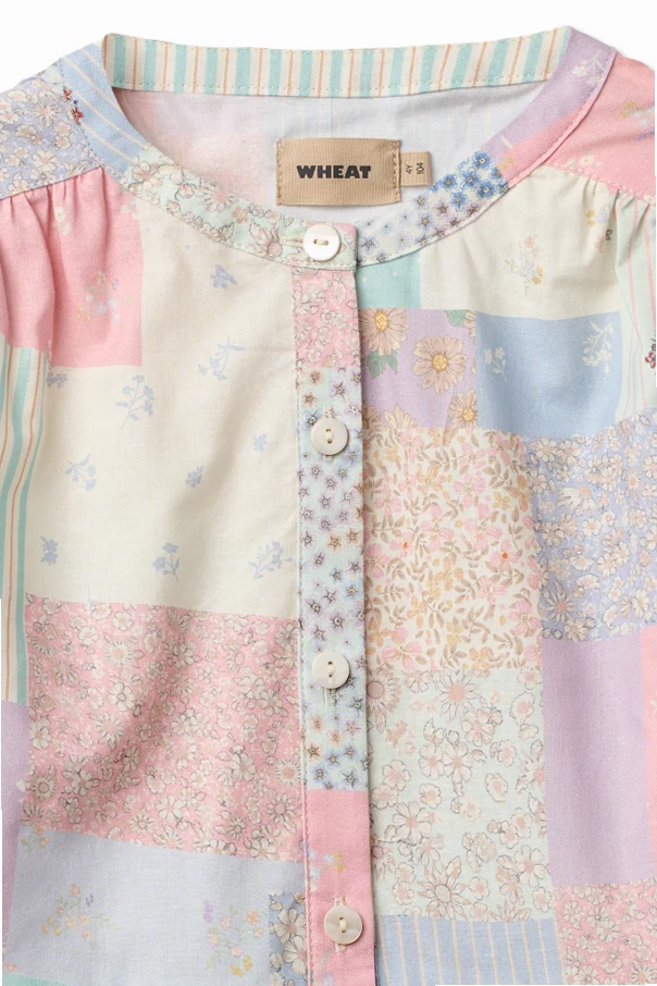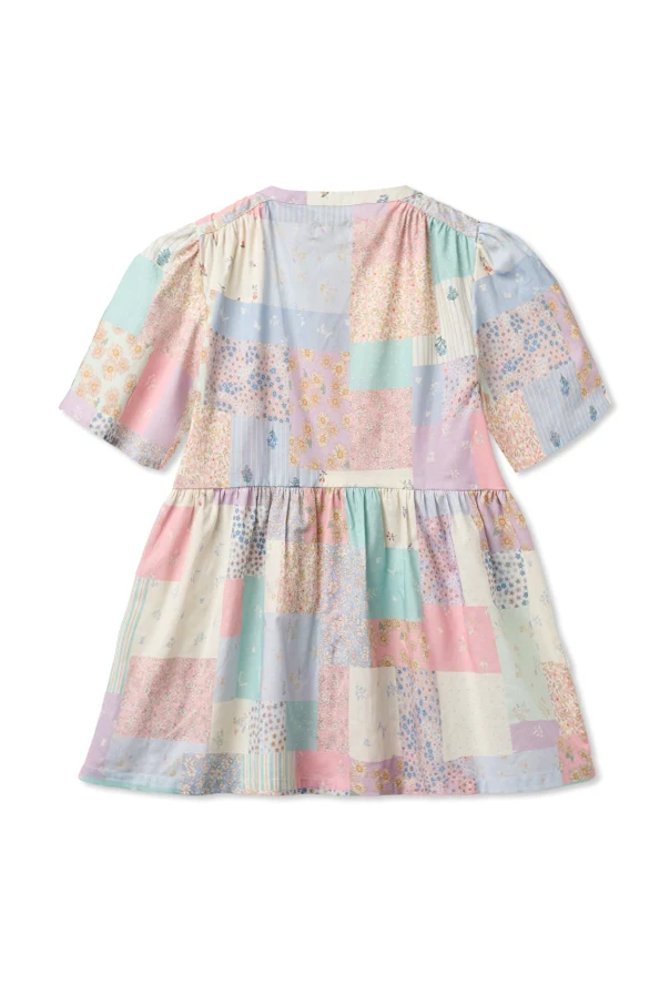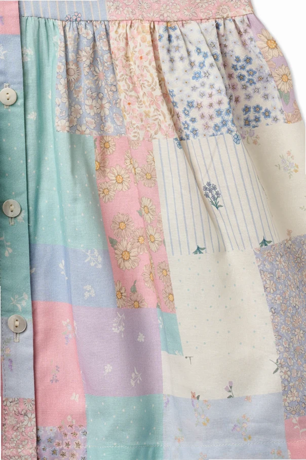 The enchanting multicolor pastel patchwork features soft roses, sky blues, mint, pale yellow, ivory, and white—arranged in dainty florals, polka dots, slender stripes, and delicate botanicals. Every element works in harmony, creating a piece as unique as the girl who wears it.