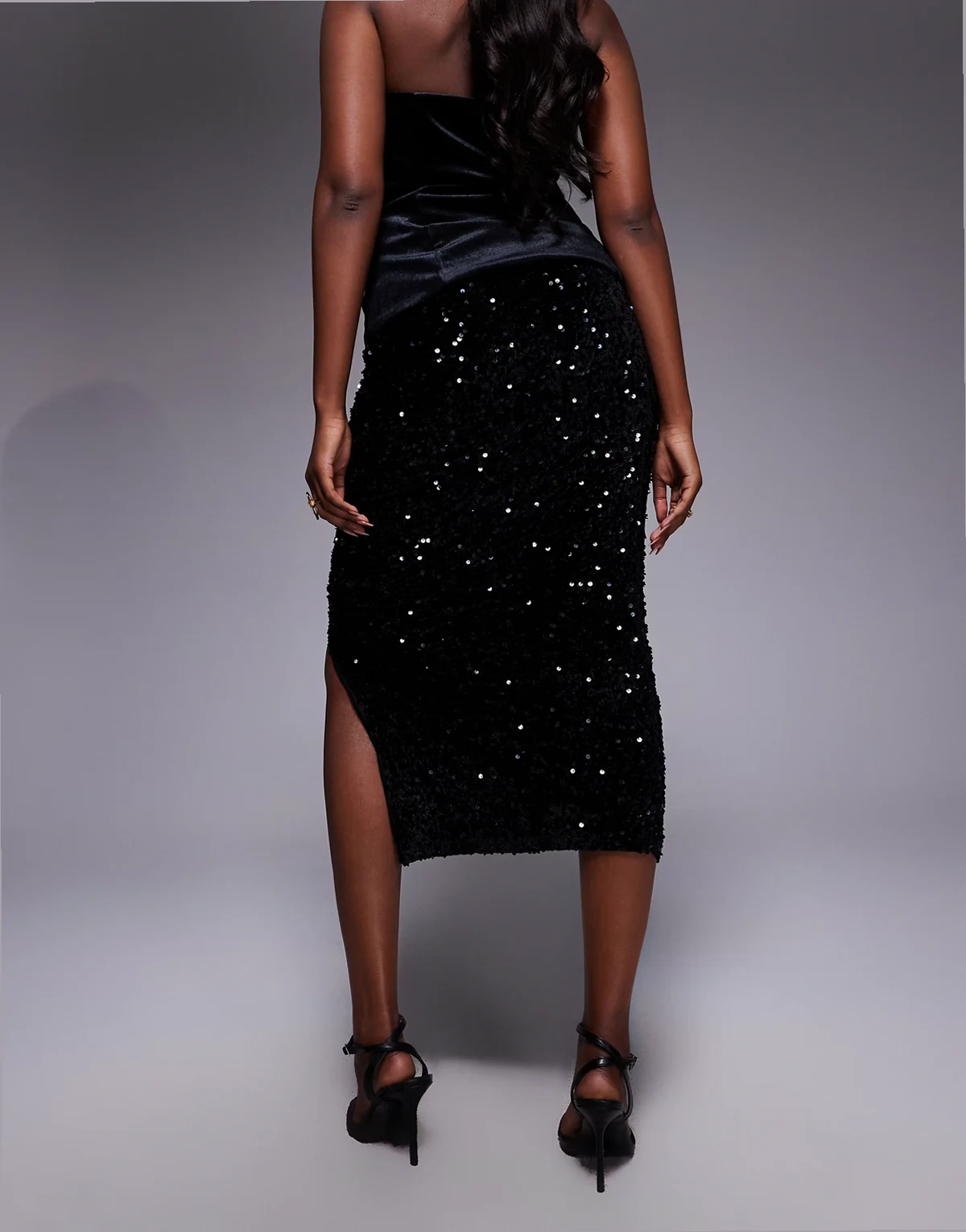 ruched side velvet sequin midi skirt in black