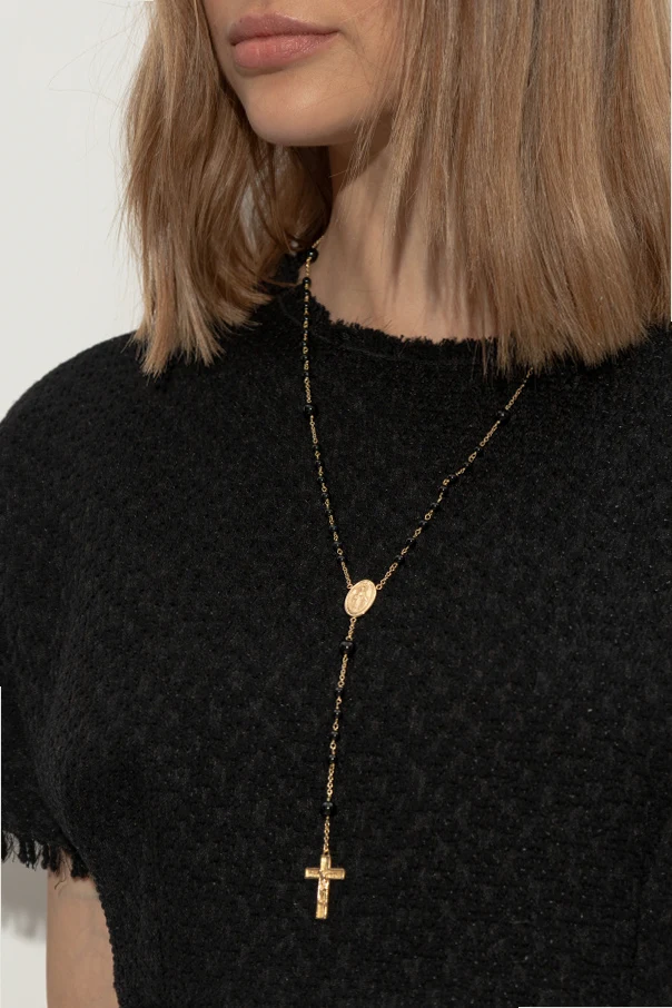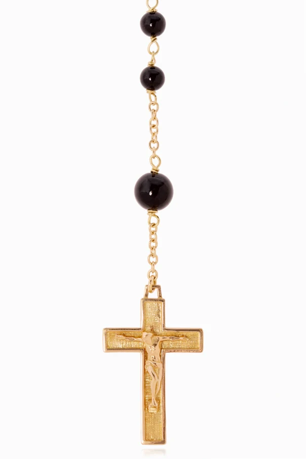 Introducing the Rosary Necklace by Dolce & Gabbana , an exquisite piece of unisex jewelry that seamlessly blends religious symbolism with contemporary elegance. This masterfully crafted necklace features a traditional rosary design, adorned with thirty-six meticulously handwoven black jade beads set on an 18 kt yellow gold chain.