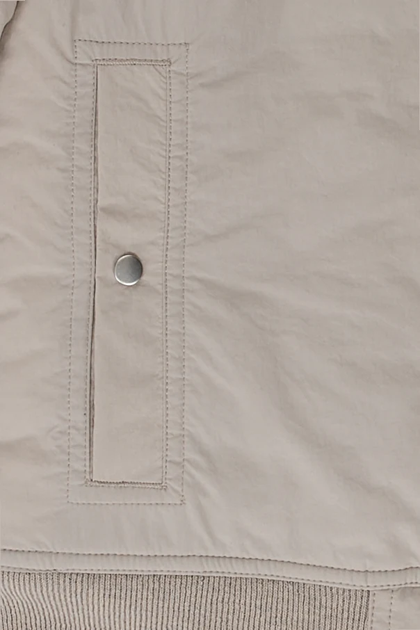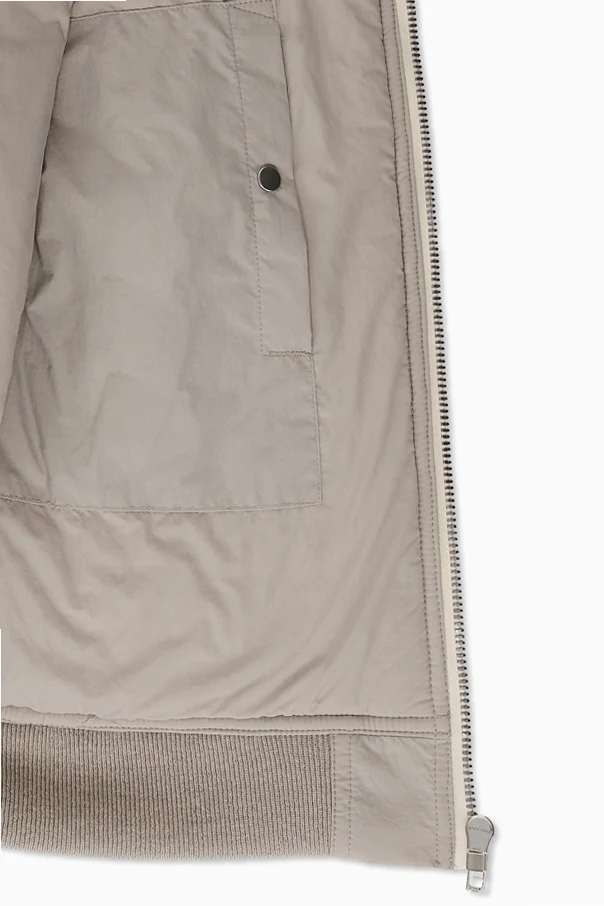 The lustrous, resilient nylon exterior effortlessly shields against the elements, while select wool components combine comfort with an elevated tactile appeal. A full-length metal zipper with a contrasting edge adds a bold touch, perfectly complemented by two front flap pockets secured with distinctive round metal snap closures.