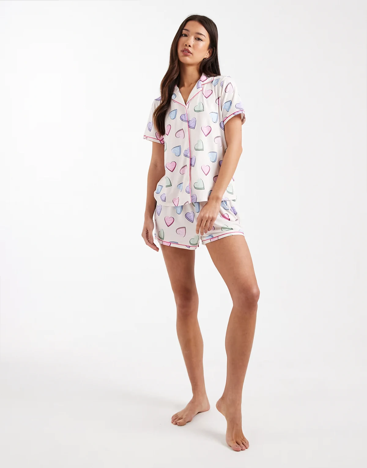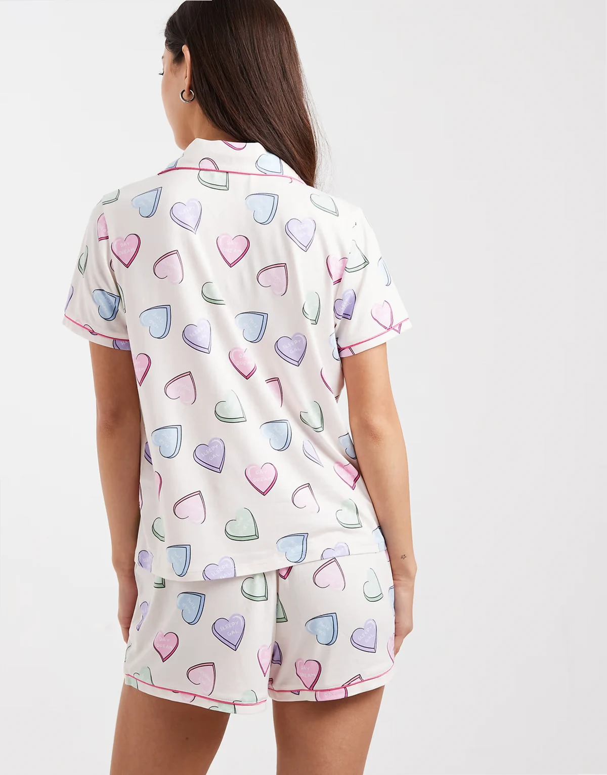 jersey camp collar top and shorts pajama set in candy hearts multi print