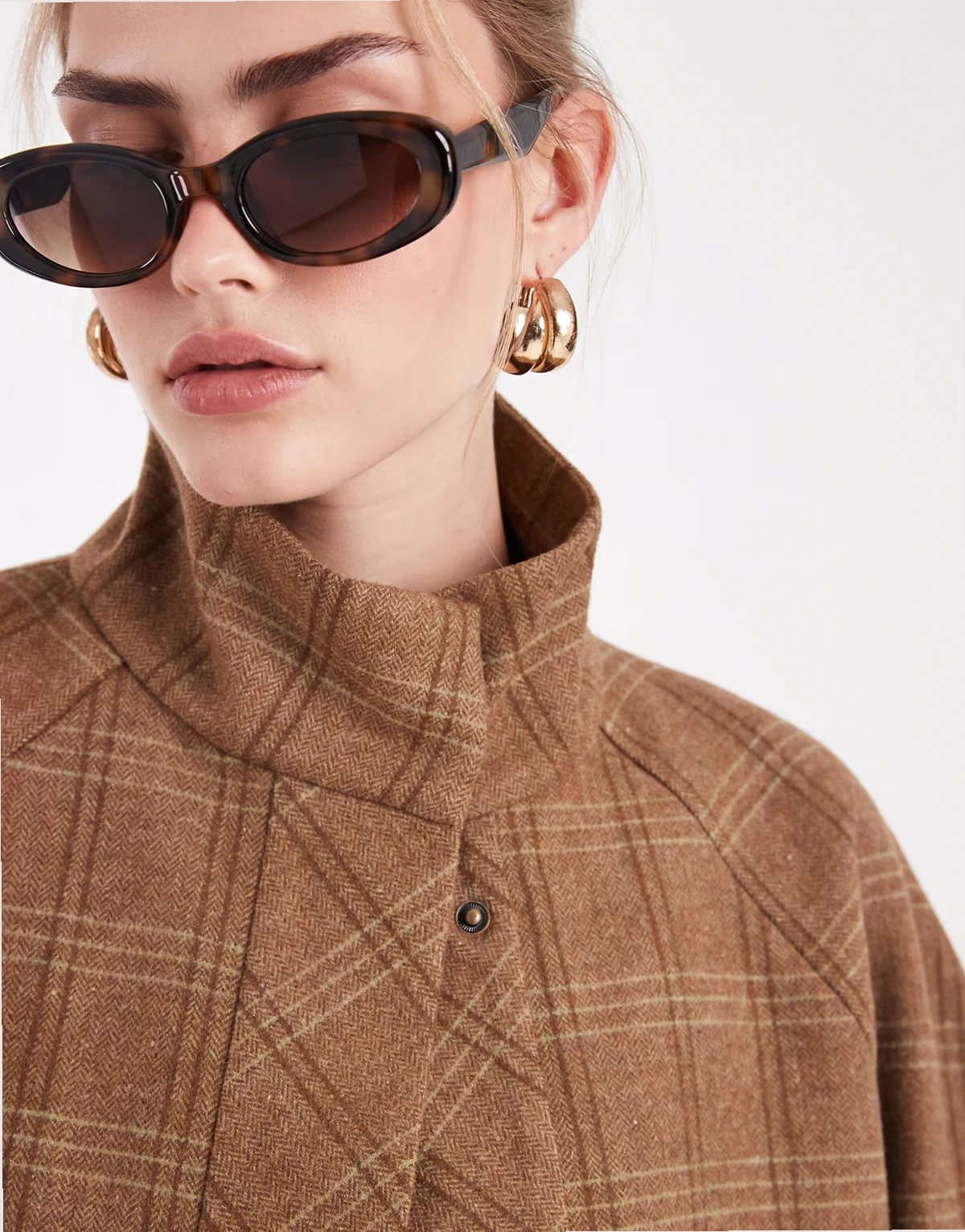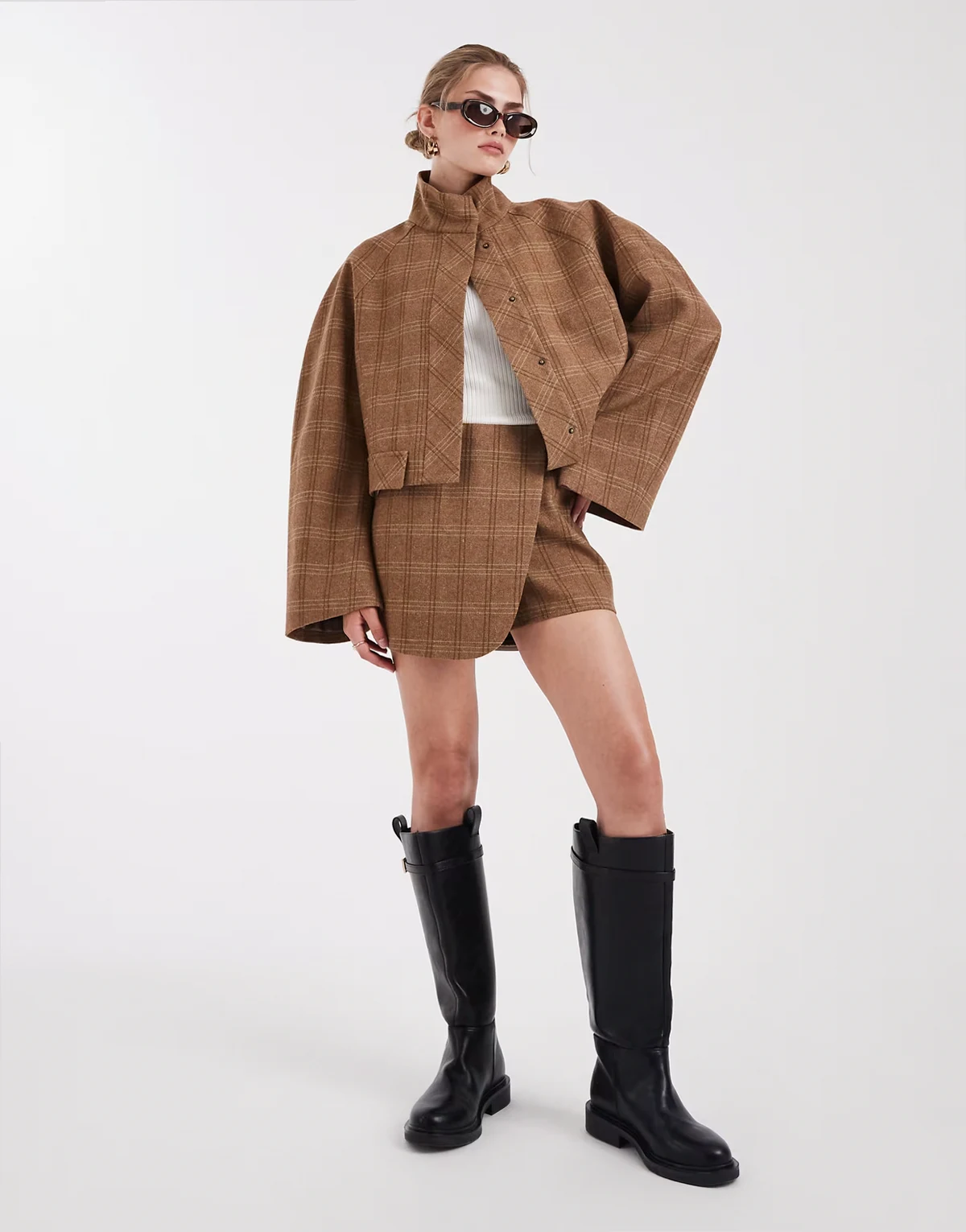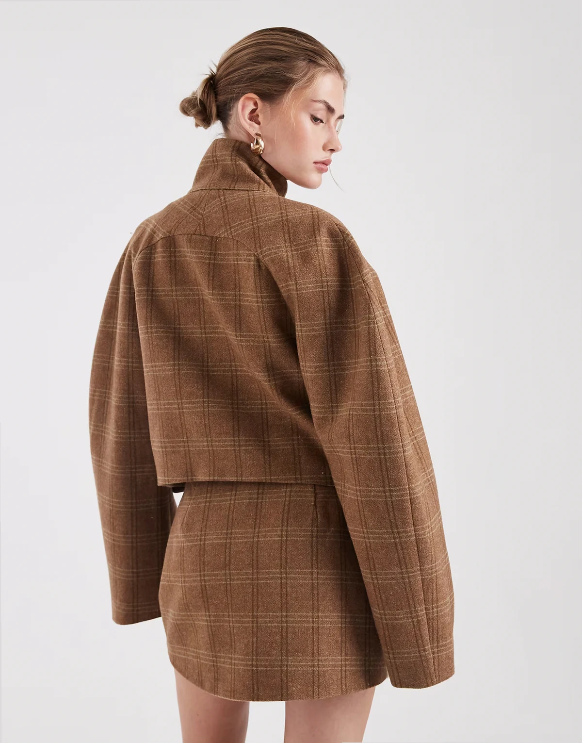4. tailored funnel neck cropped jacket in brushed plaid - part of a set