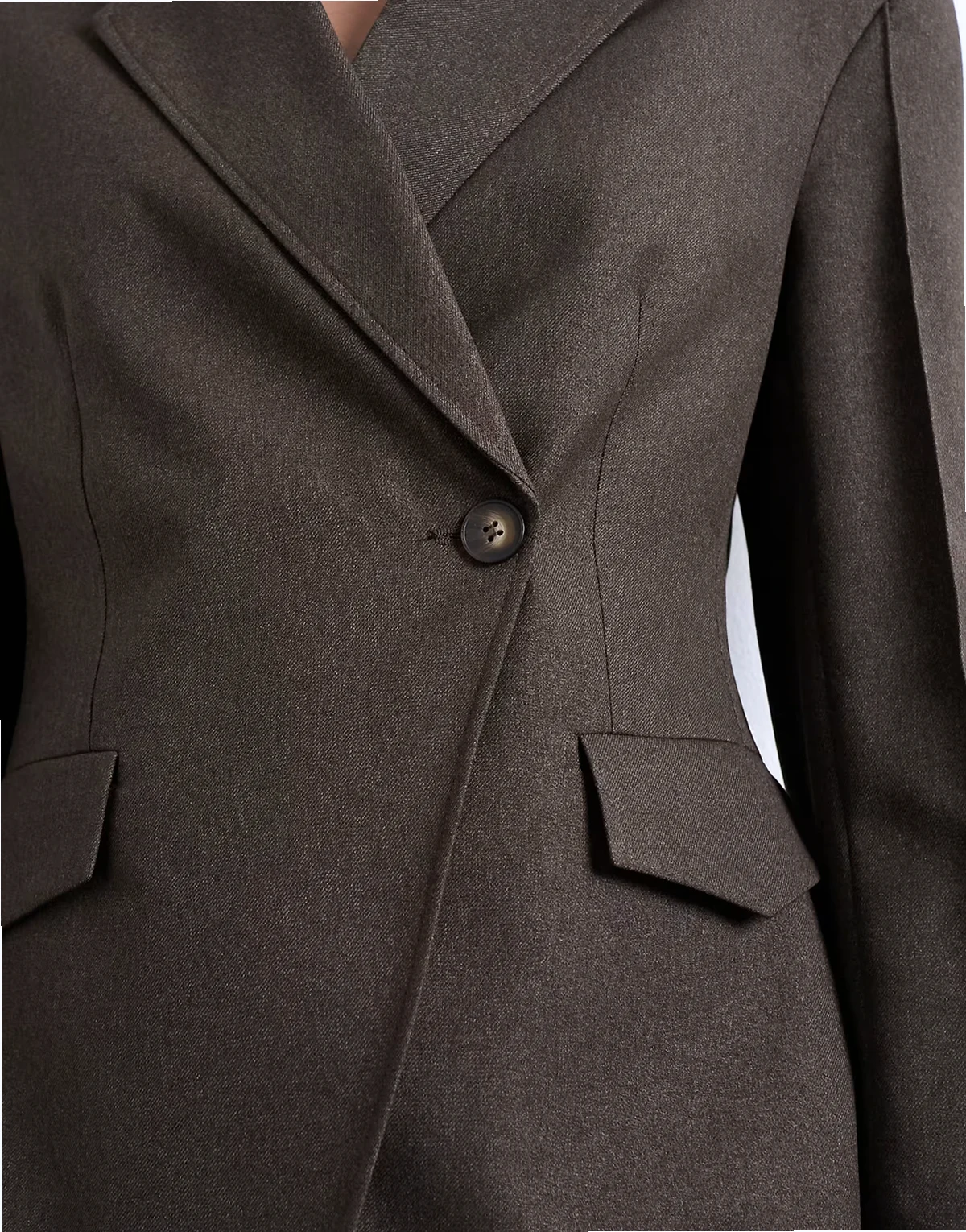 asymmetric wrap blazer with seam details in brown - part of a set