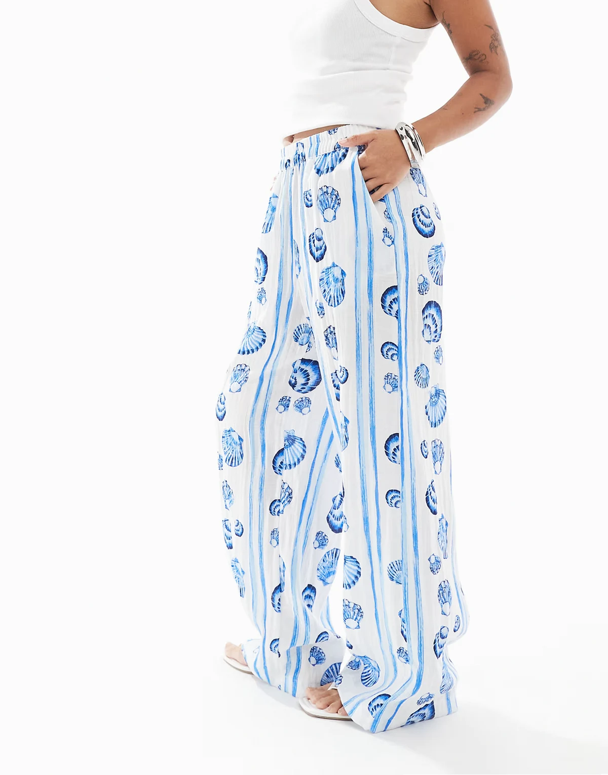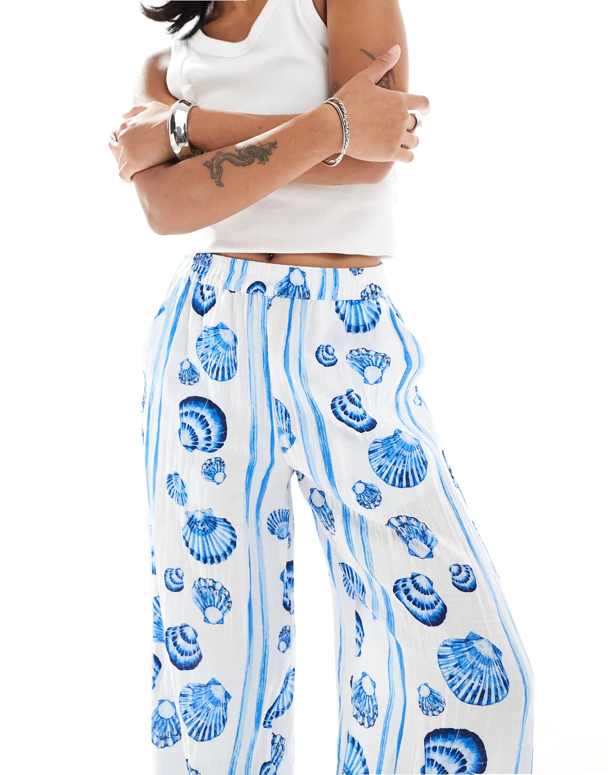 straight leg pants in blue seashell print