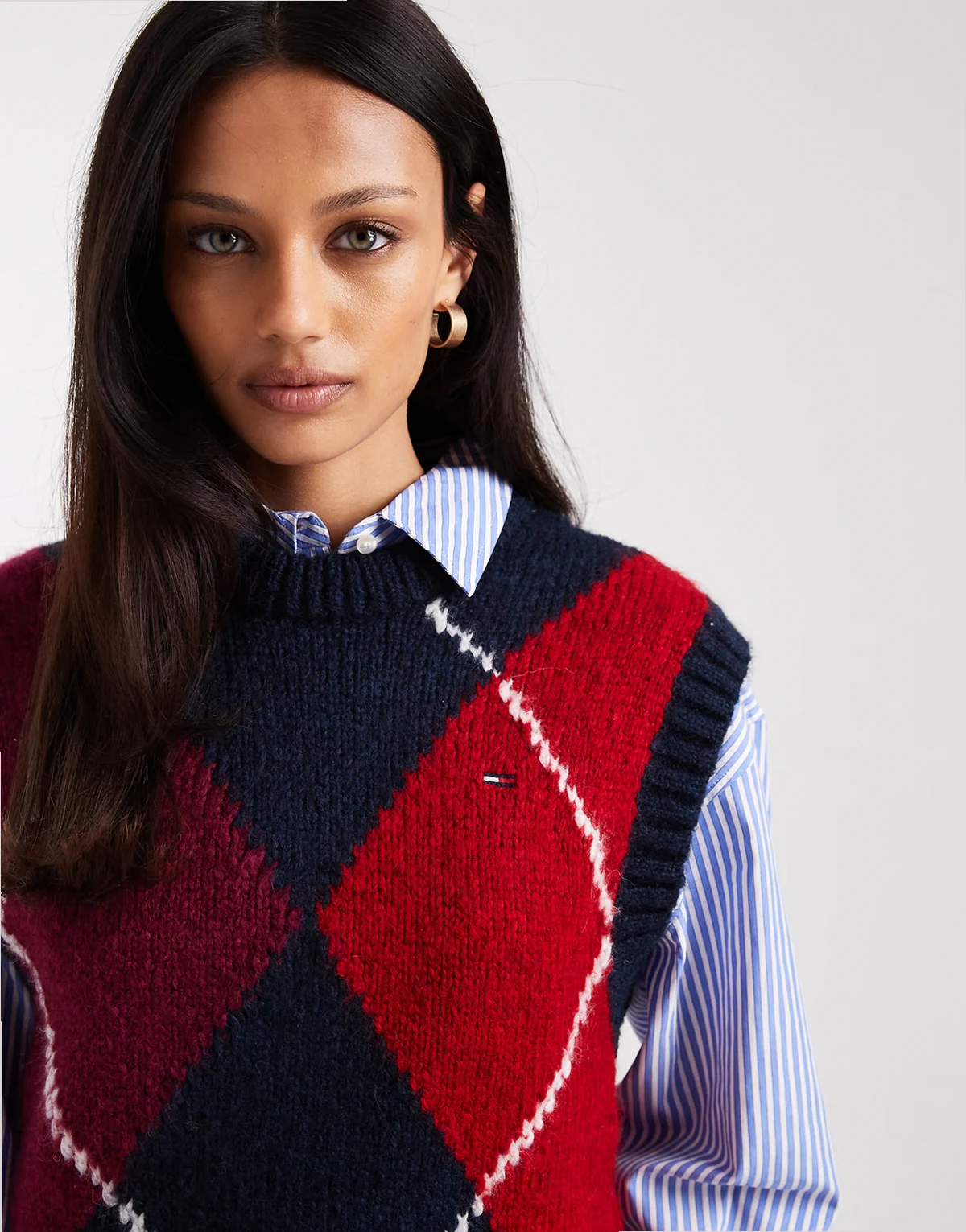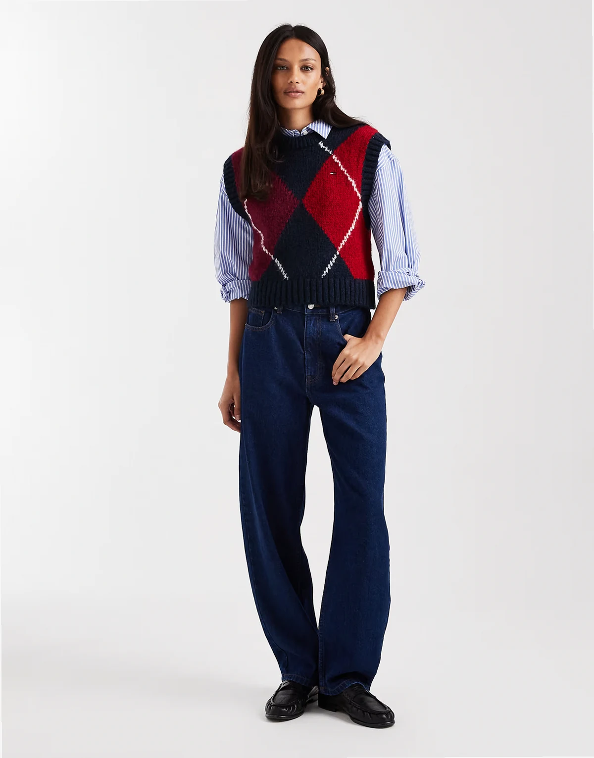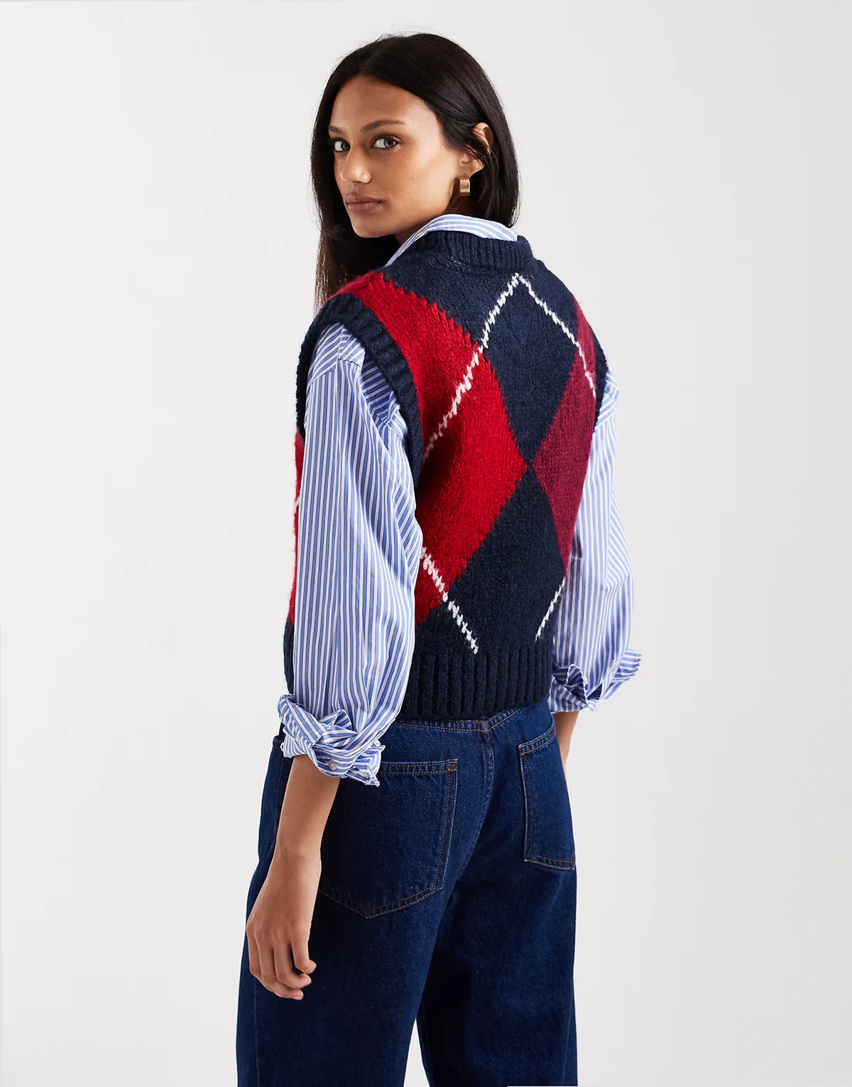 argyle sweater vest in burgundy and navy