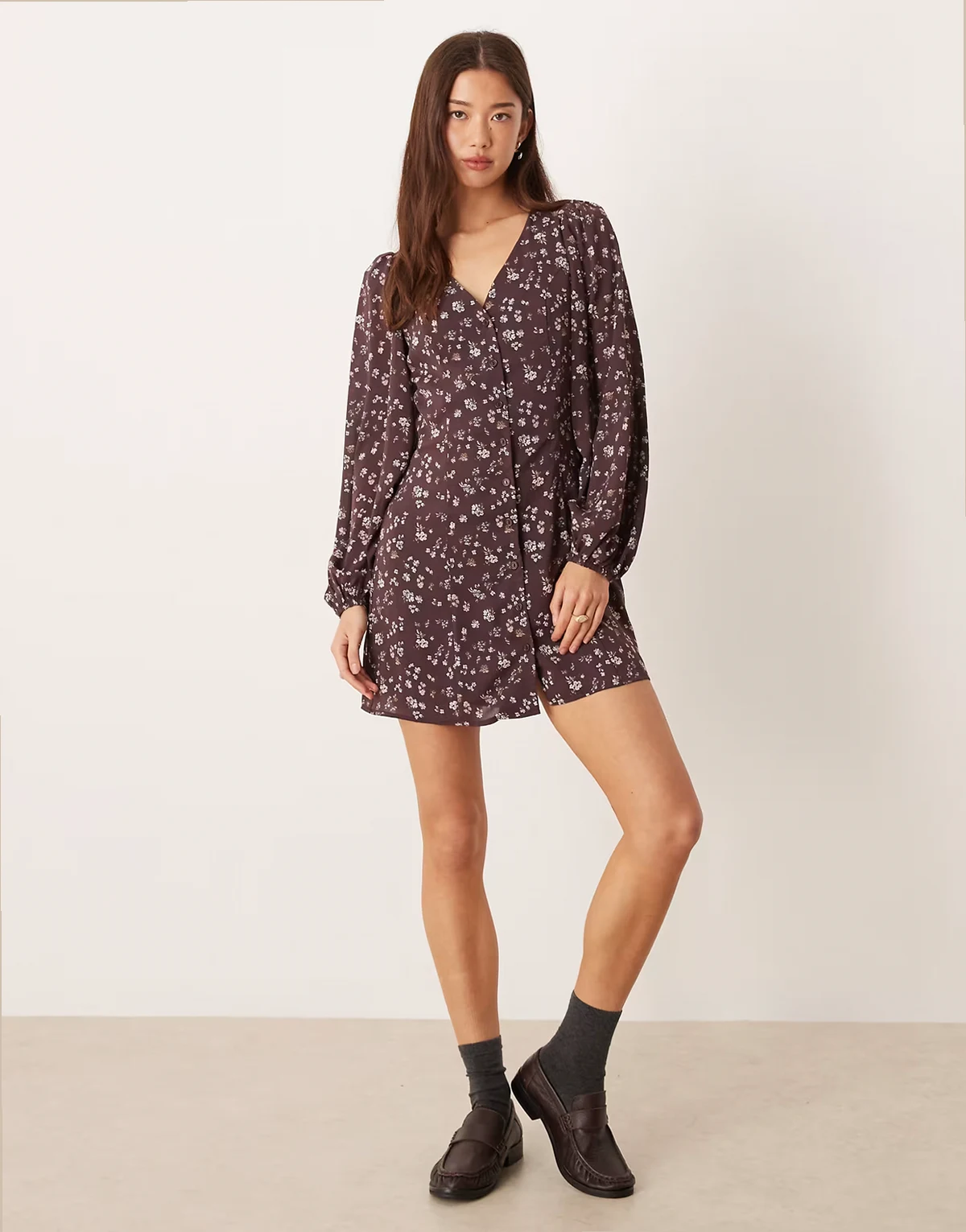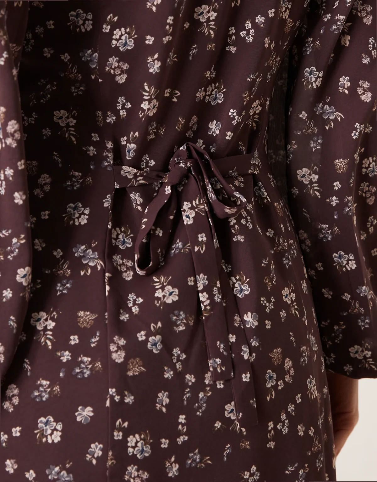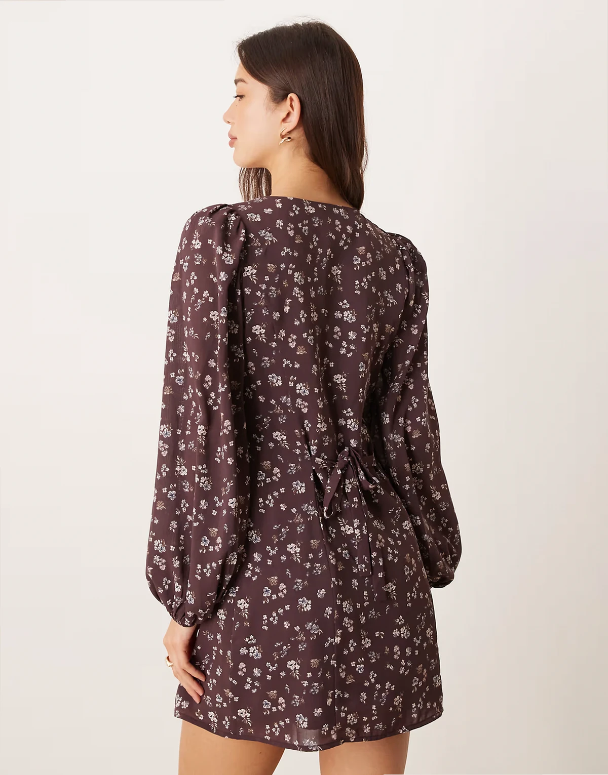 long sleeve mini tea dress with tie front in brown ditsy floral