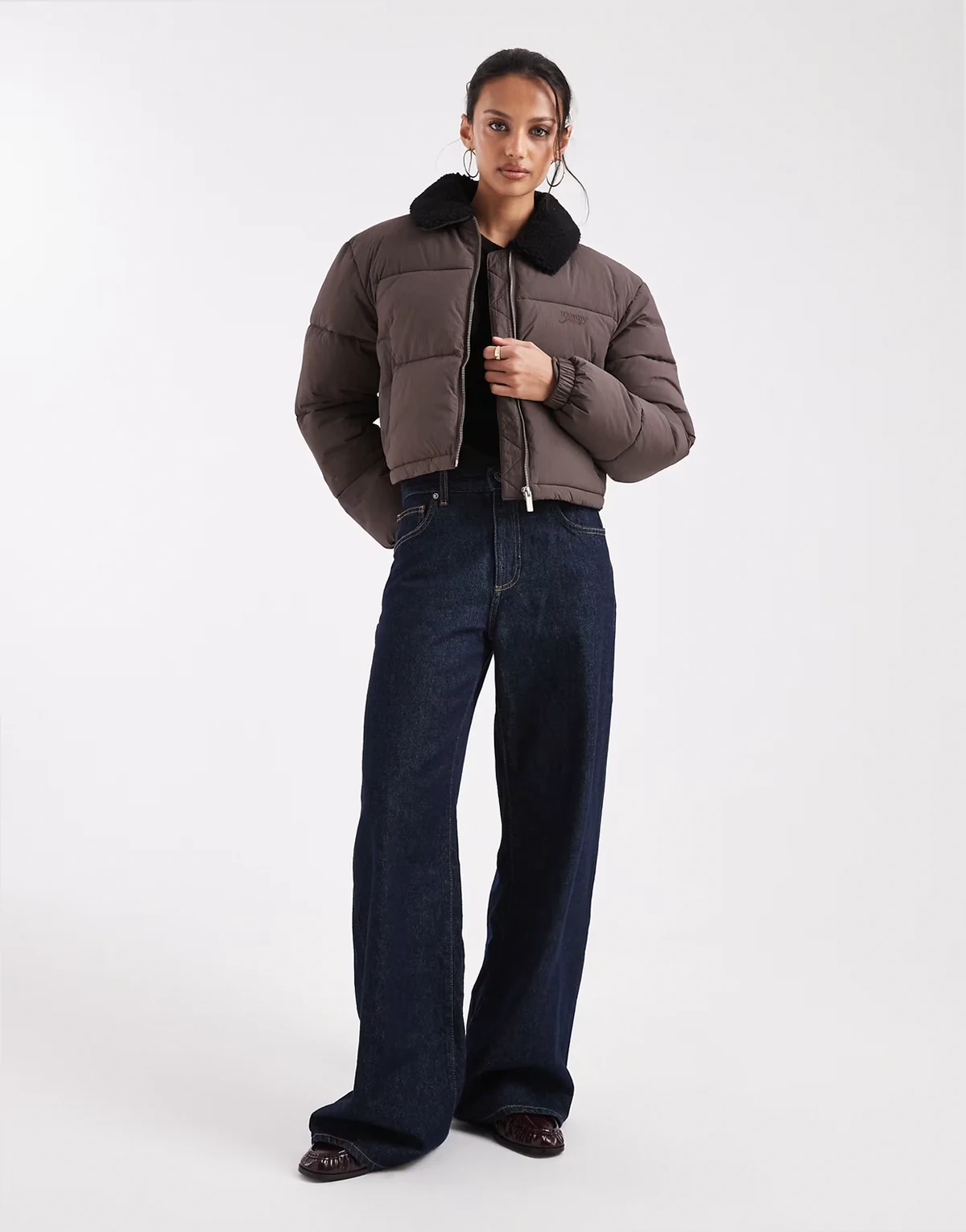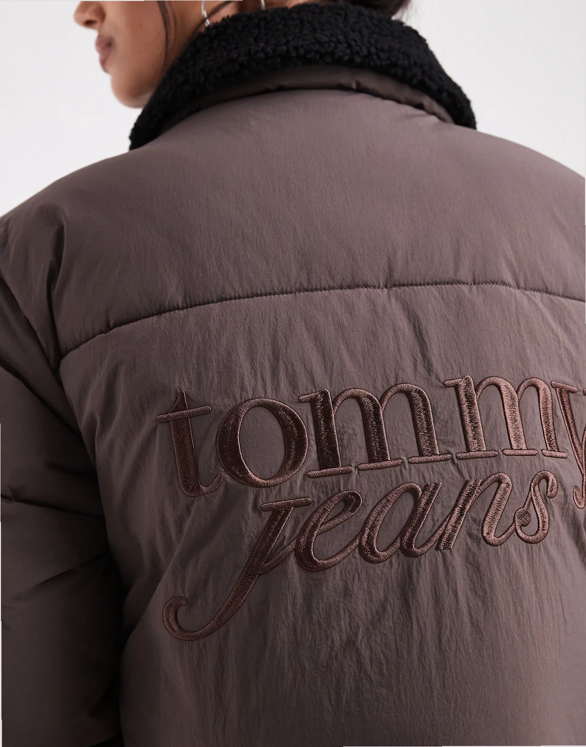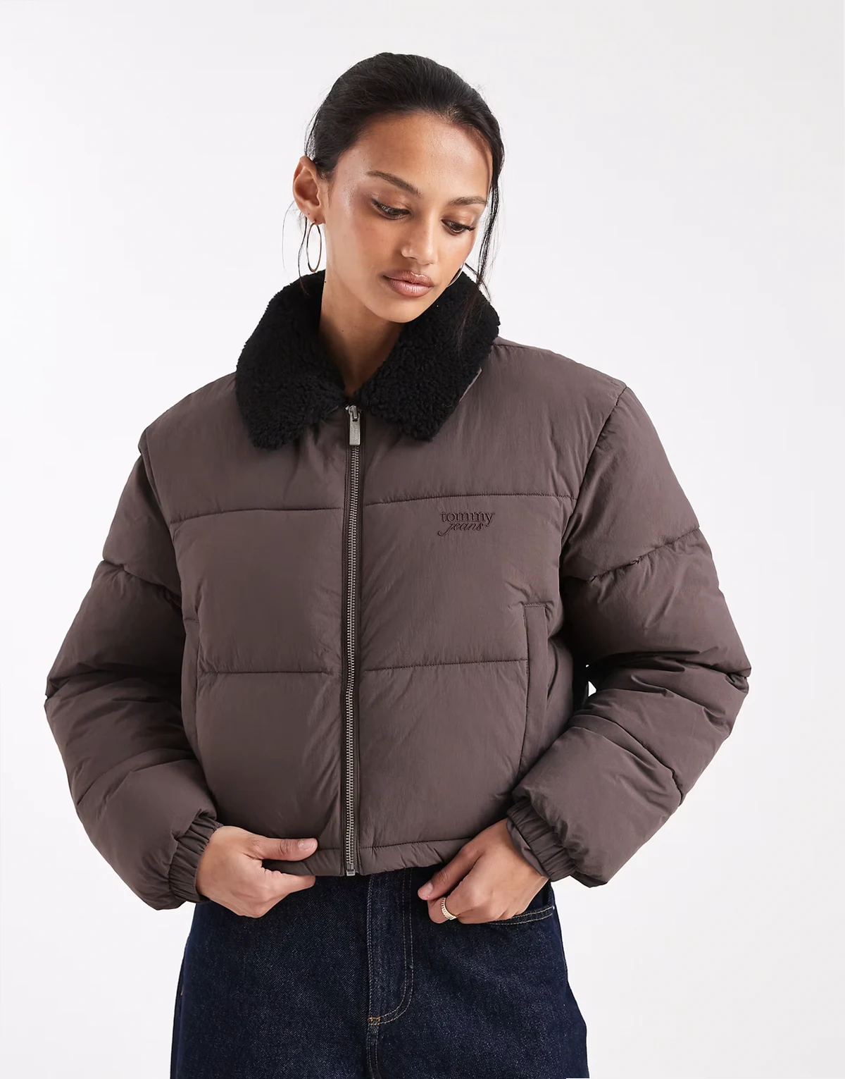 teddy collar puffer jacket in brown