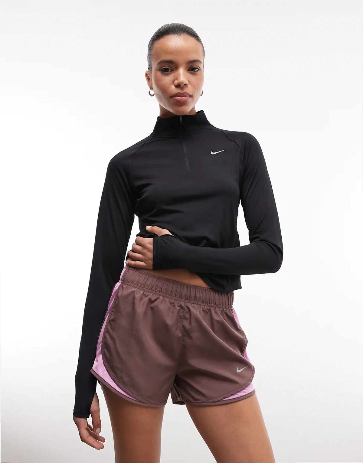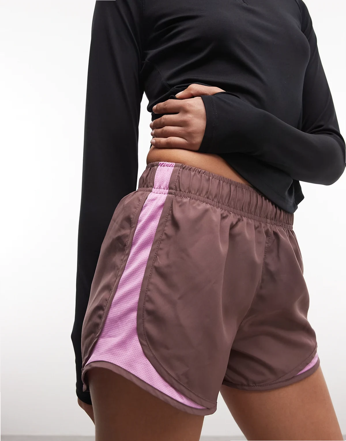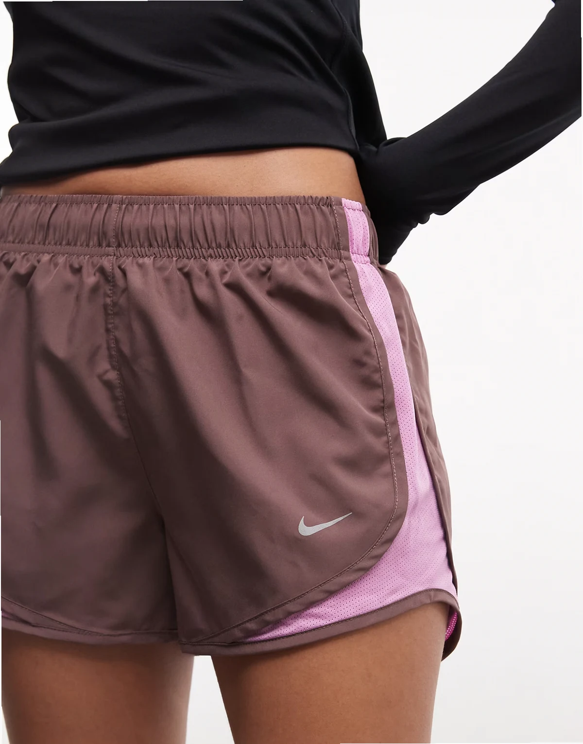 Nike Tempo Running 3inch shorts in brown with purple side detailing