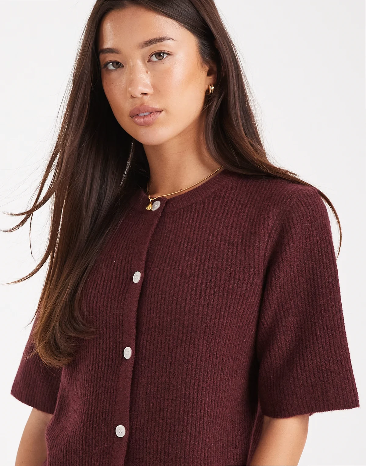 soft knit short sleeve cardigan in burgundy