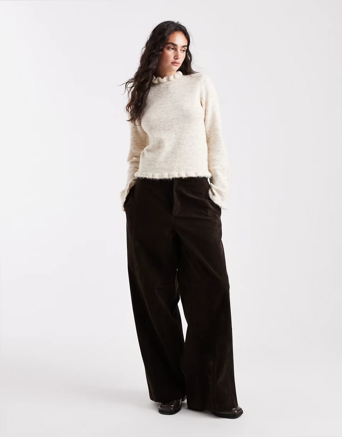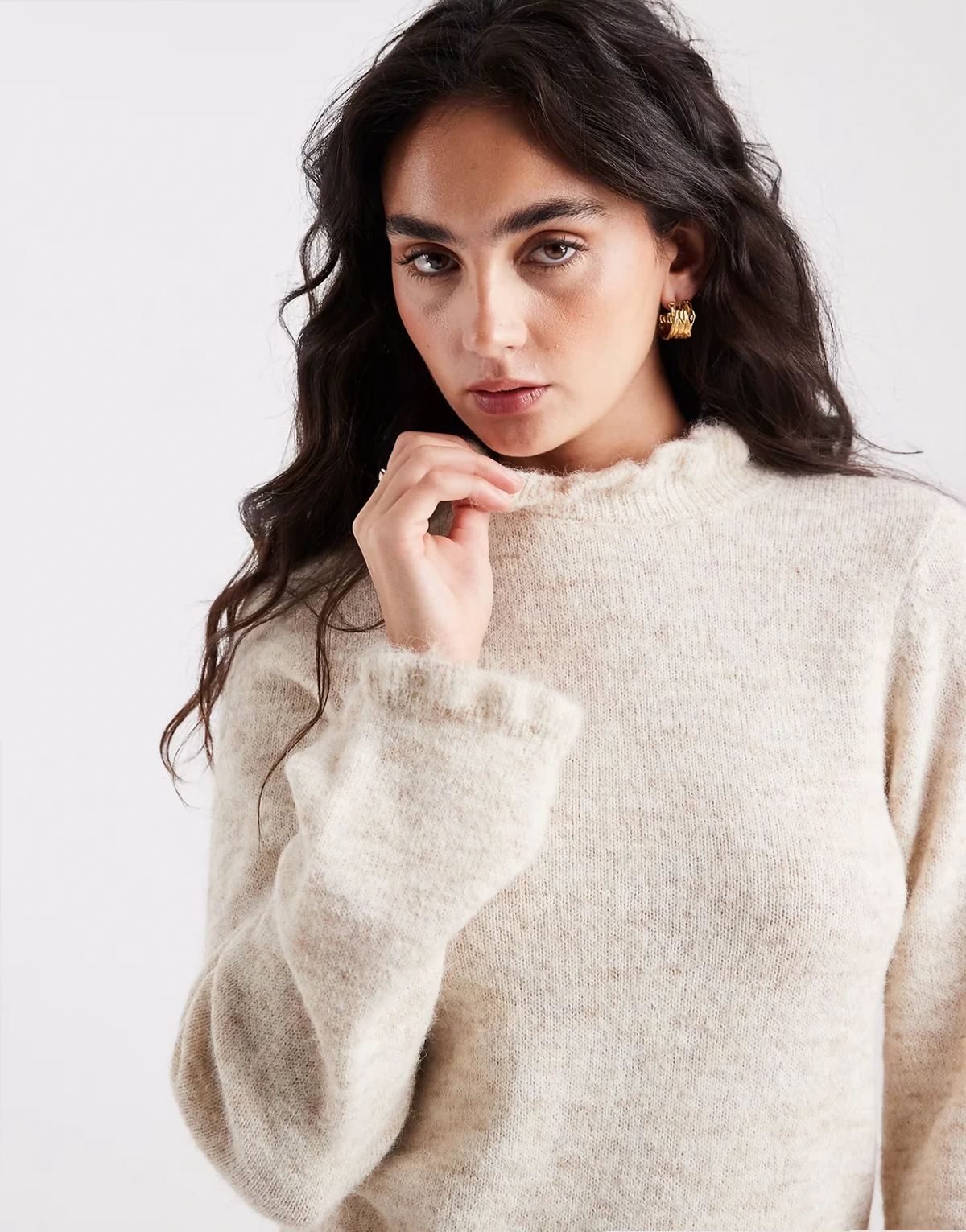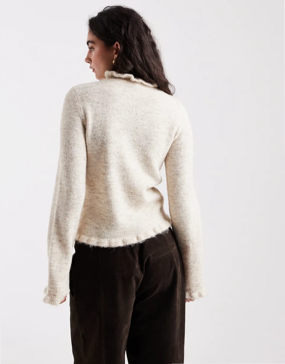 frill neck knit sweater in cream melange