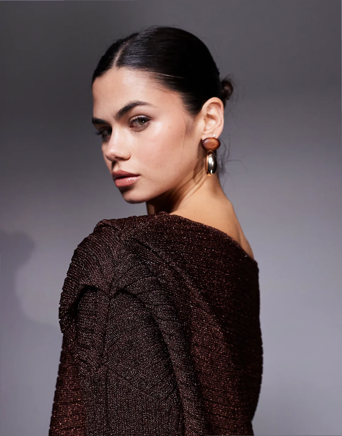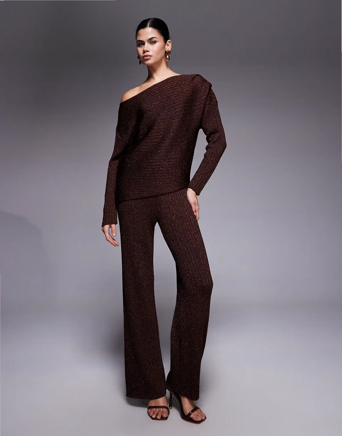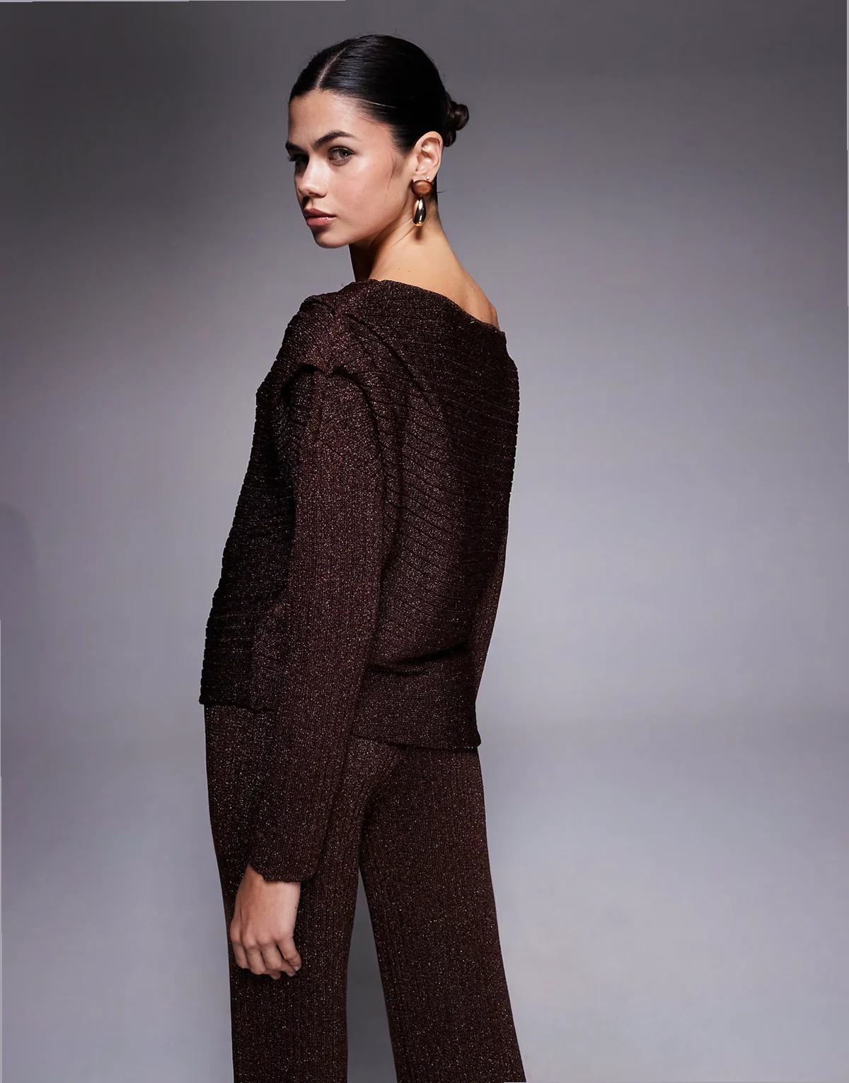 one-shoulder glitter textured loungewear top in brown - part of a set