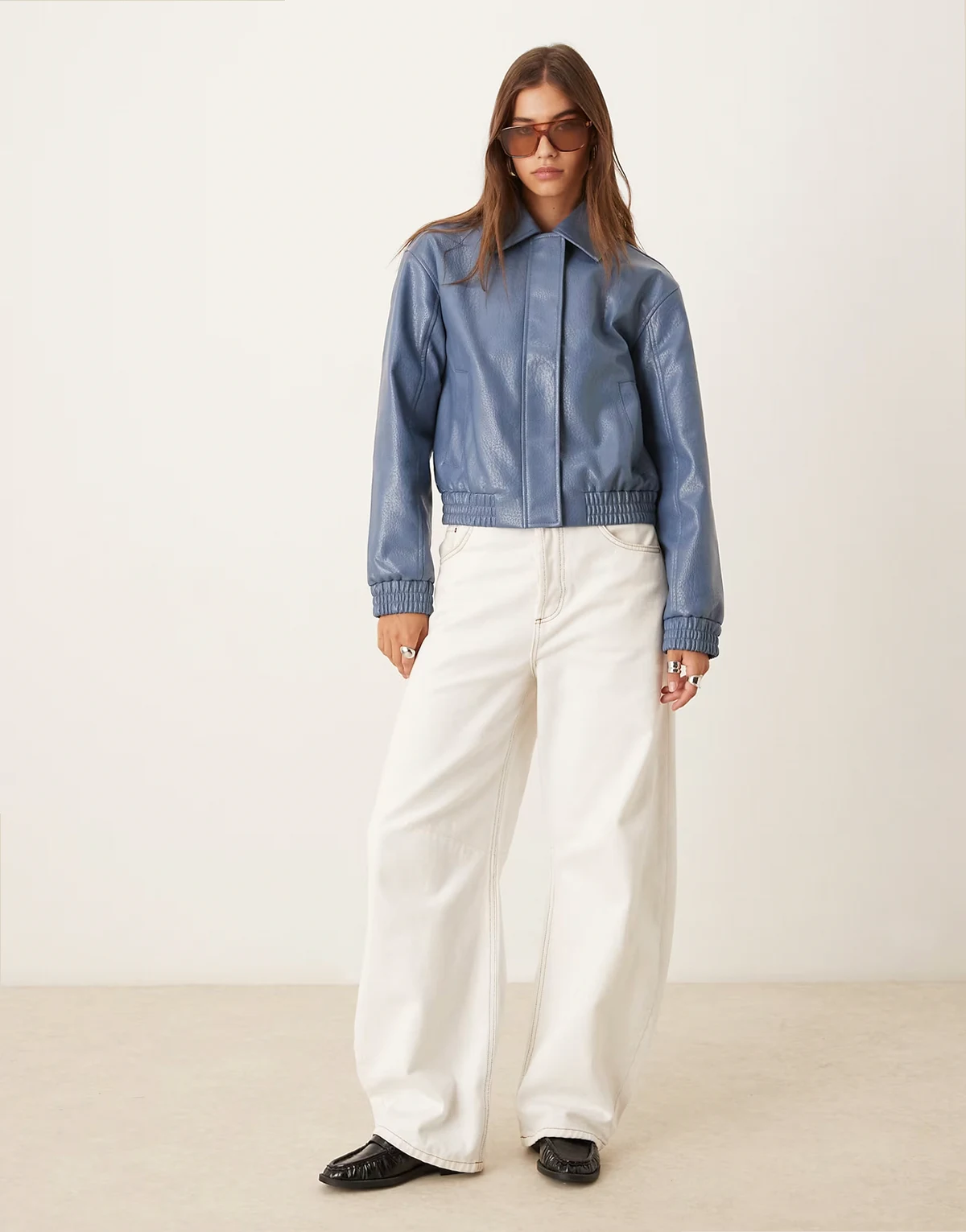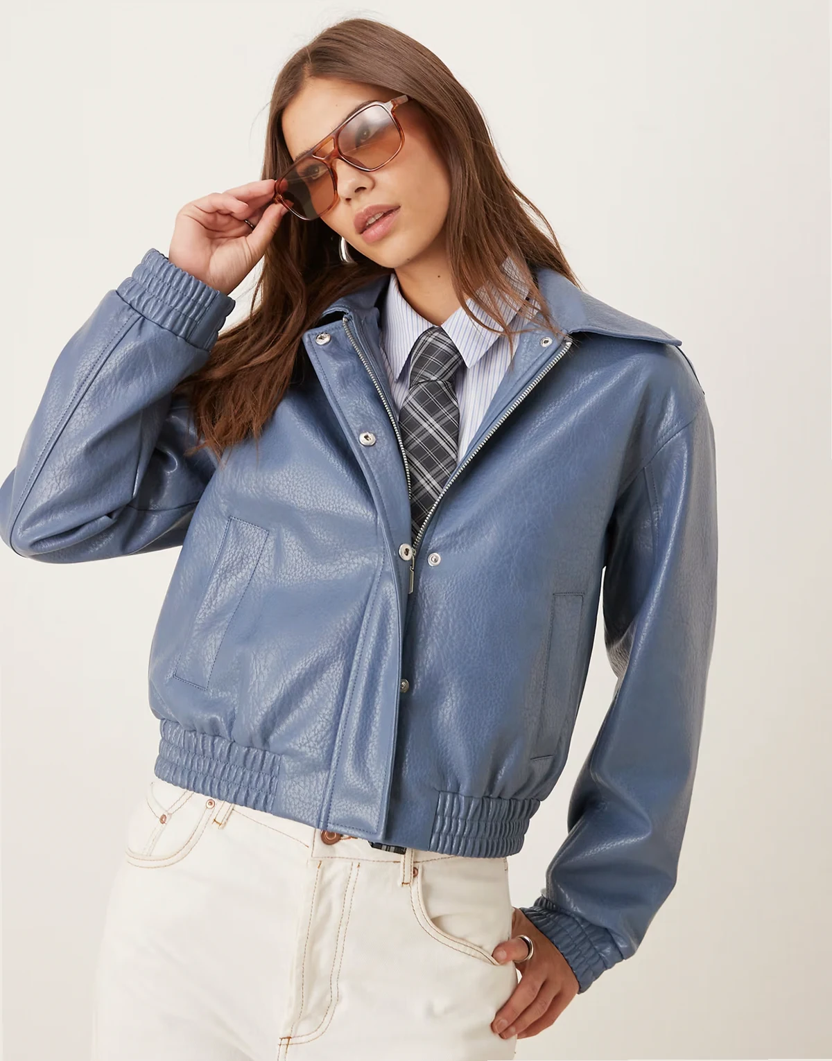 faux leather bomber jacket in blue