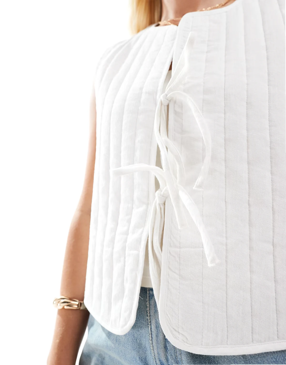 lightweight quilted tie front summer vest in cloud white