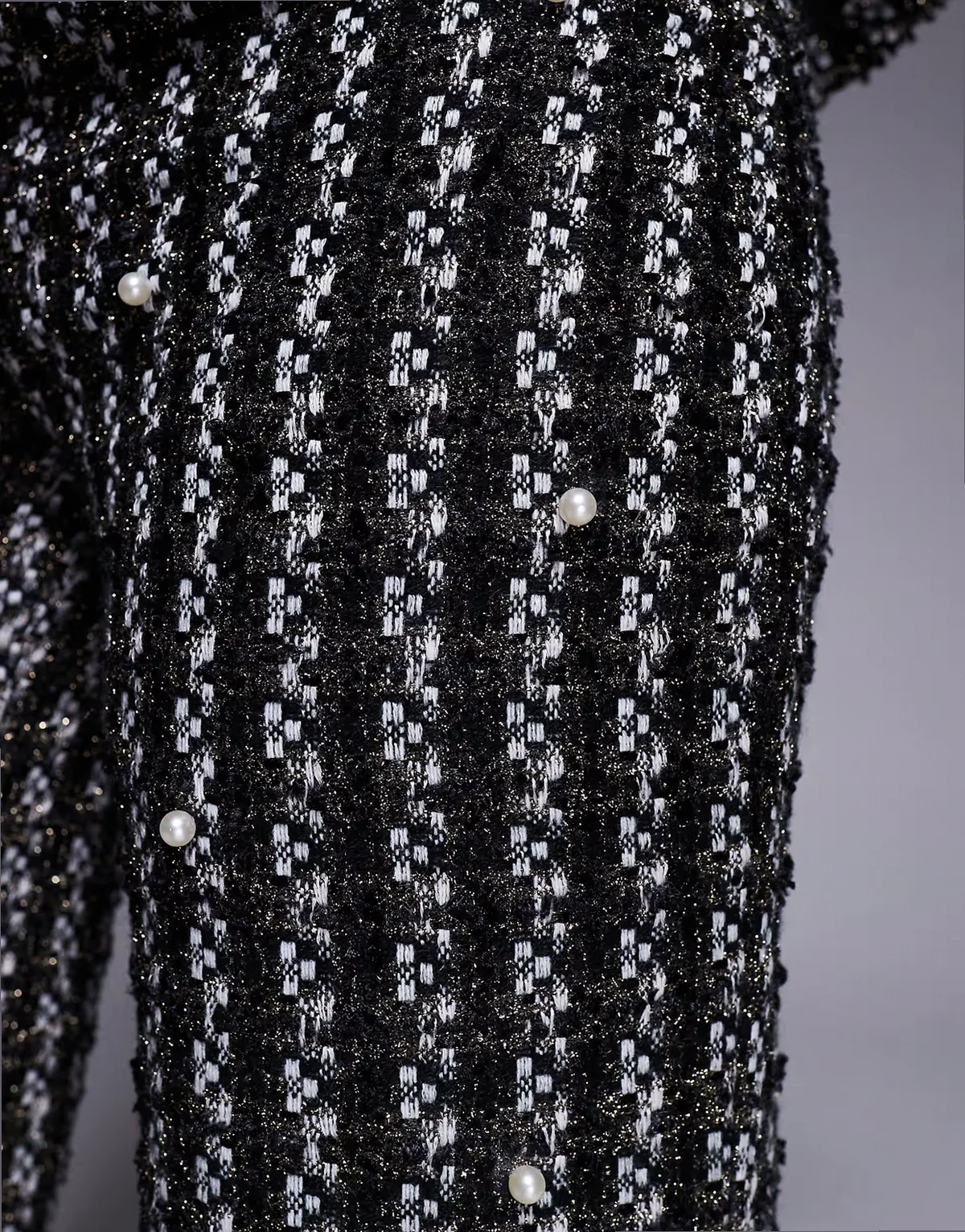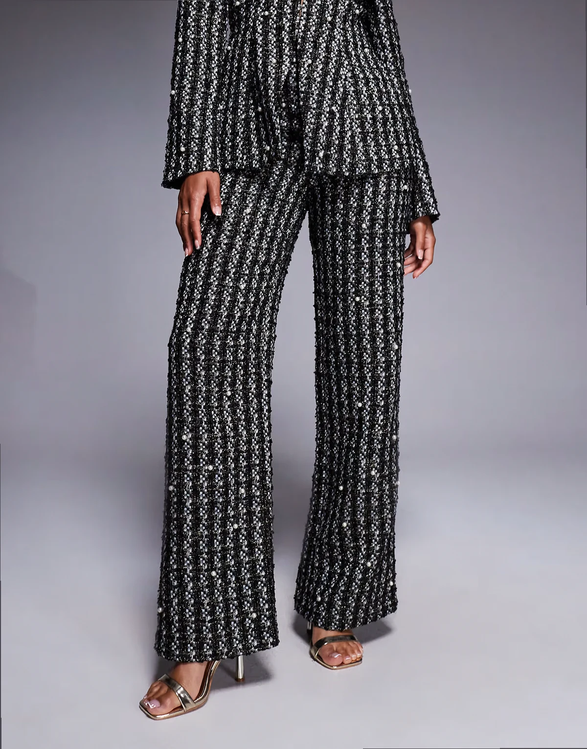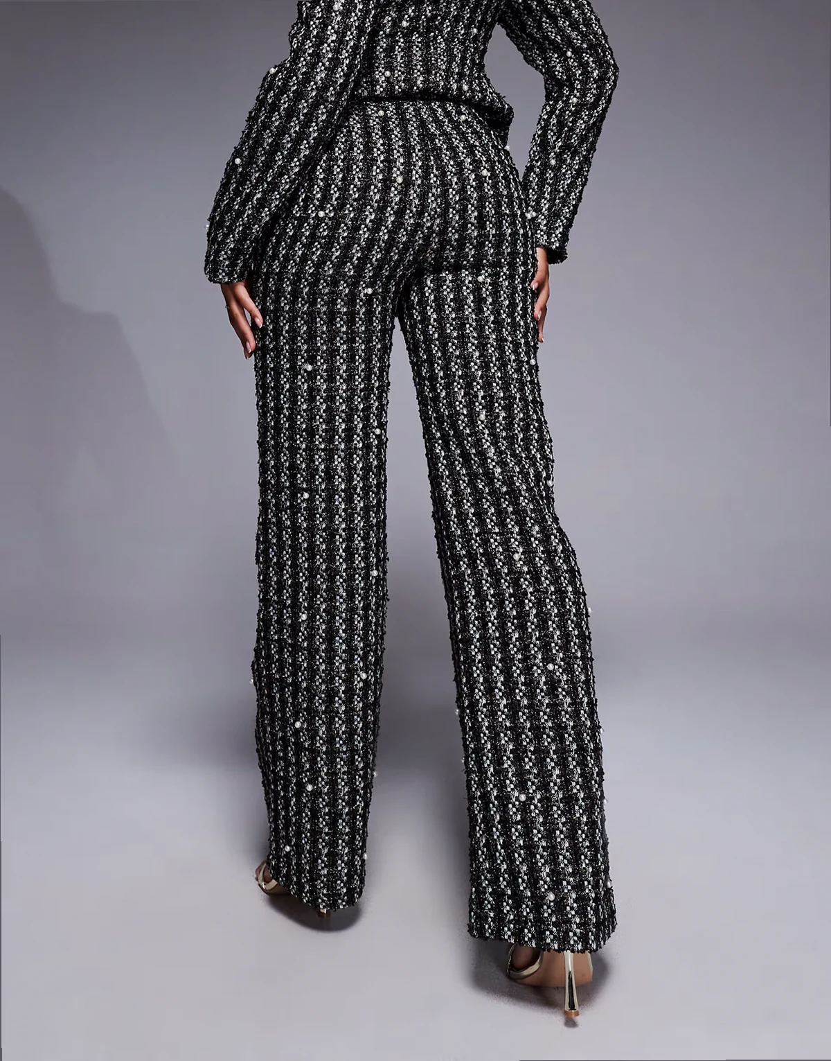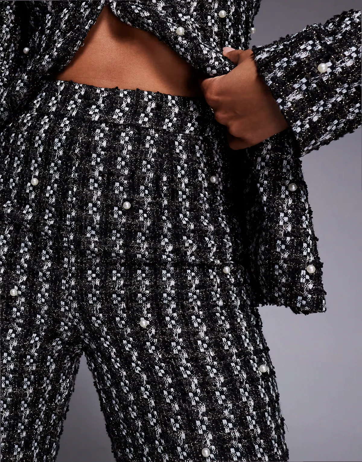 pearl embellished boucle pants in black - part of a set