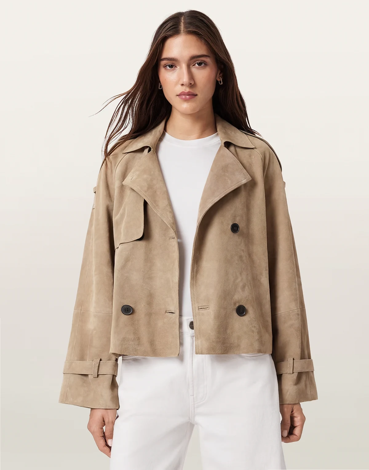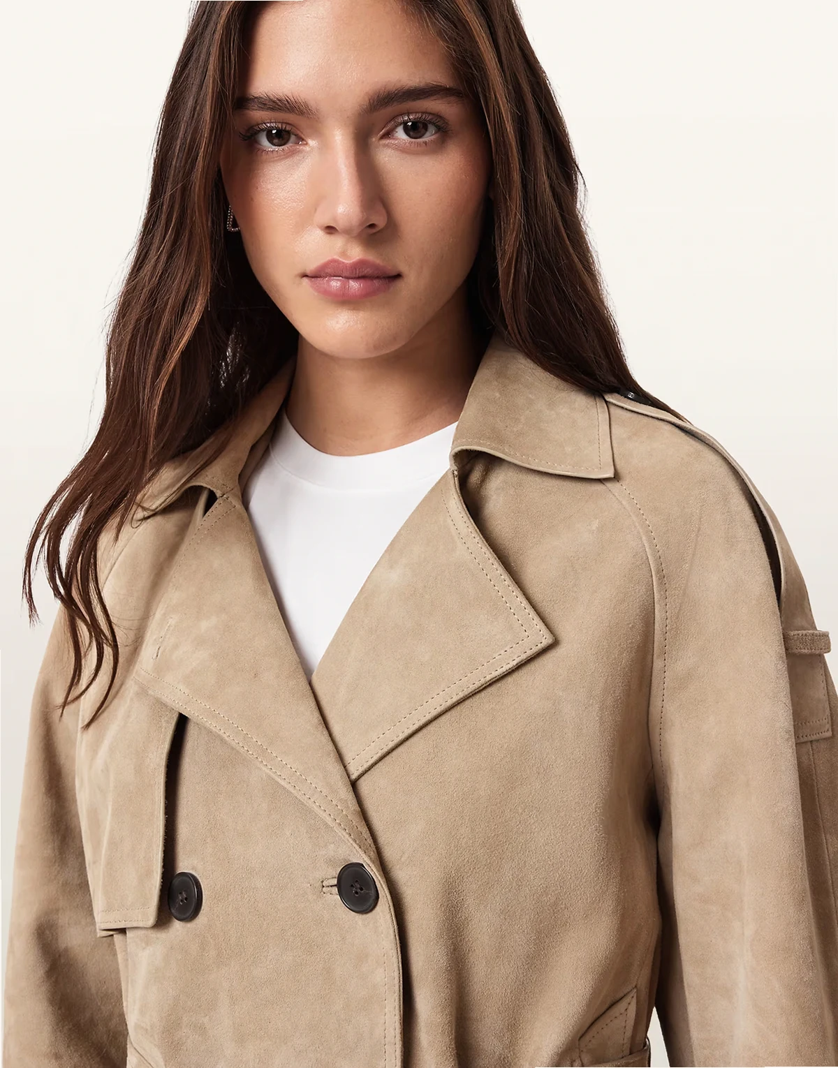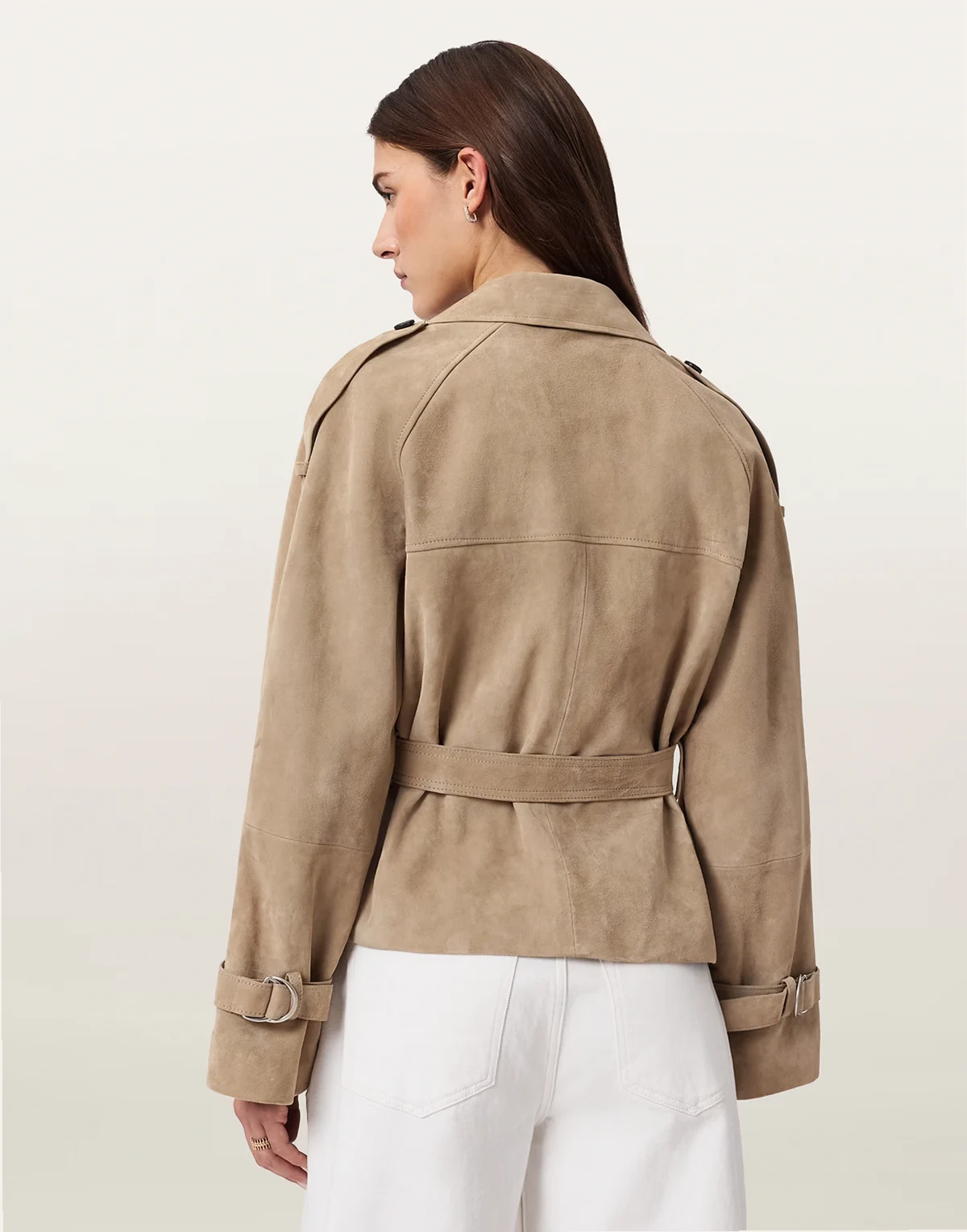reed short belted suede trench coat in taupe