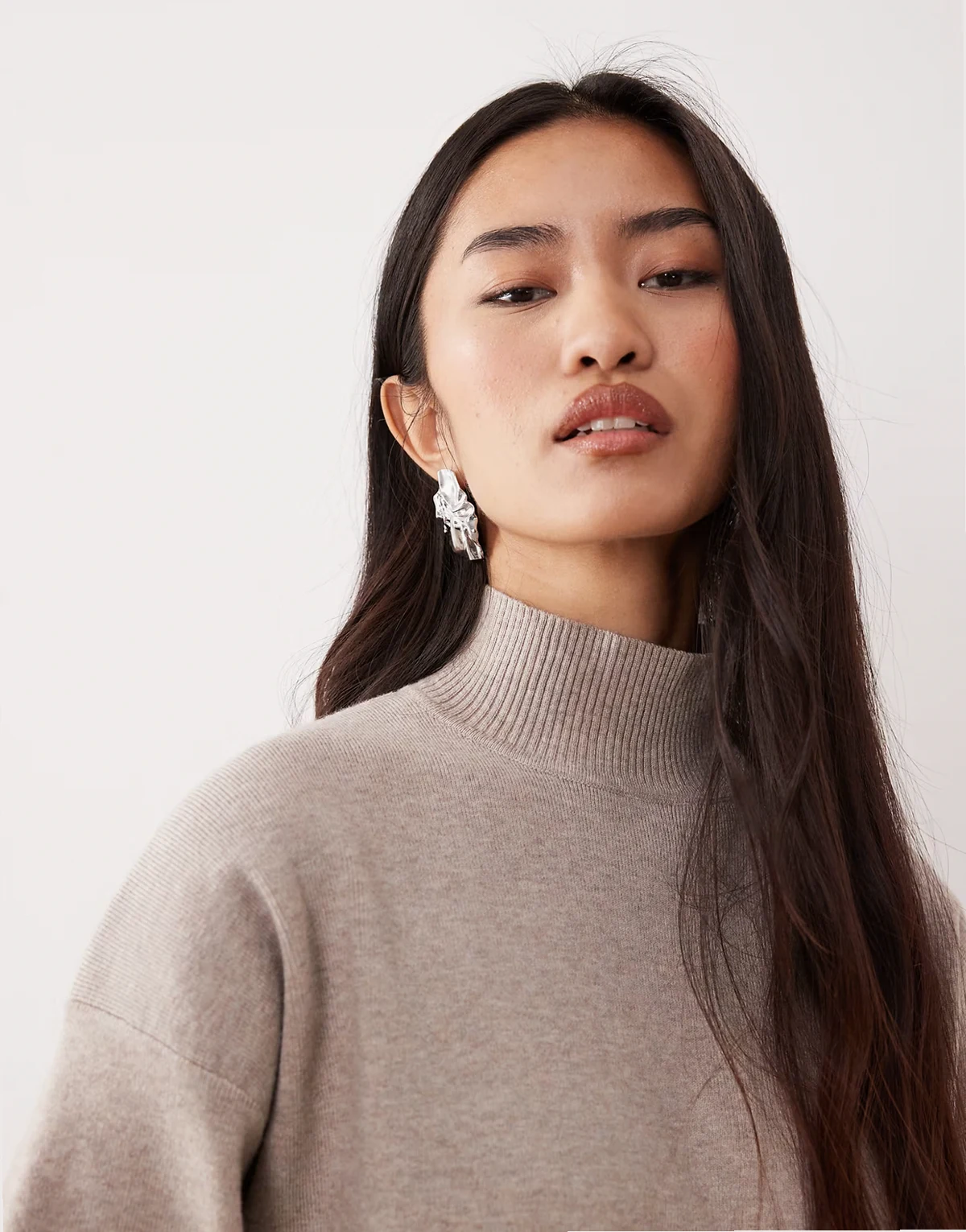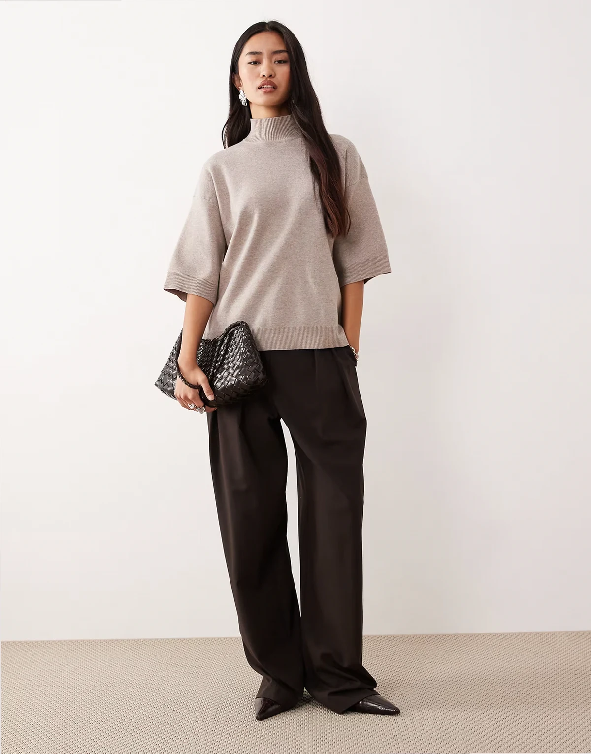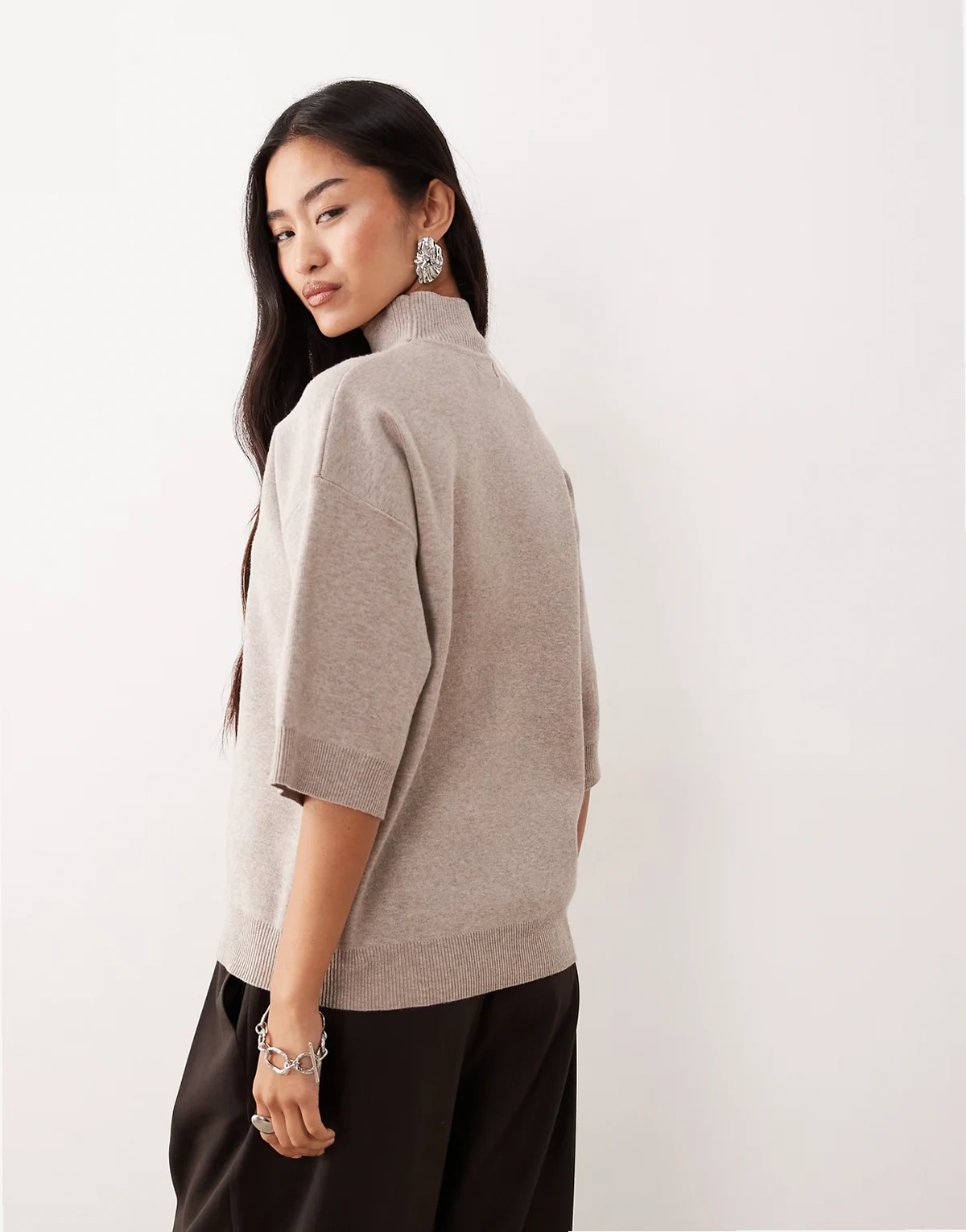 knit turtle neck cropped sleeves sweater in beige