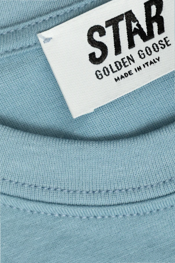 The striking blue tee features a timeless, regular fit with a classic crew neck and short sleeves. Its front is adorned with a bold “STAR GOLDEN GOOSE” print—where the letter “A” in “STAR” reveals a distinctive star-shaped cutout, marking the hallmark of this renowned designer label. The interior neck proudly displays a “MADE IN ITALY” tag, underscoring its prestigious origin.
