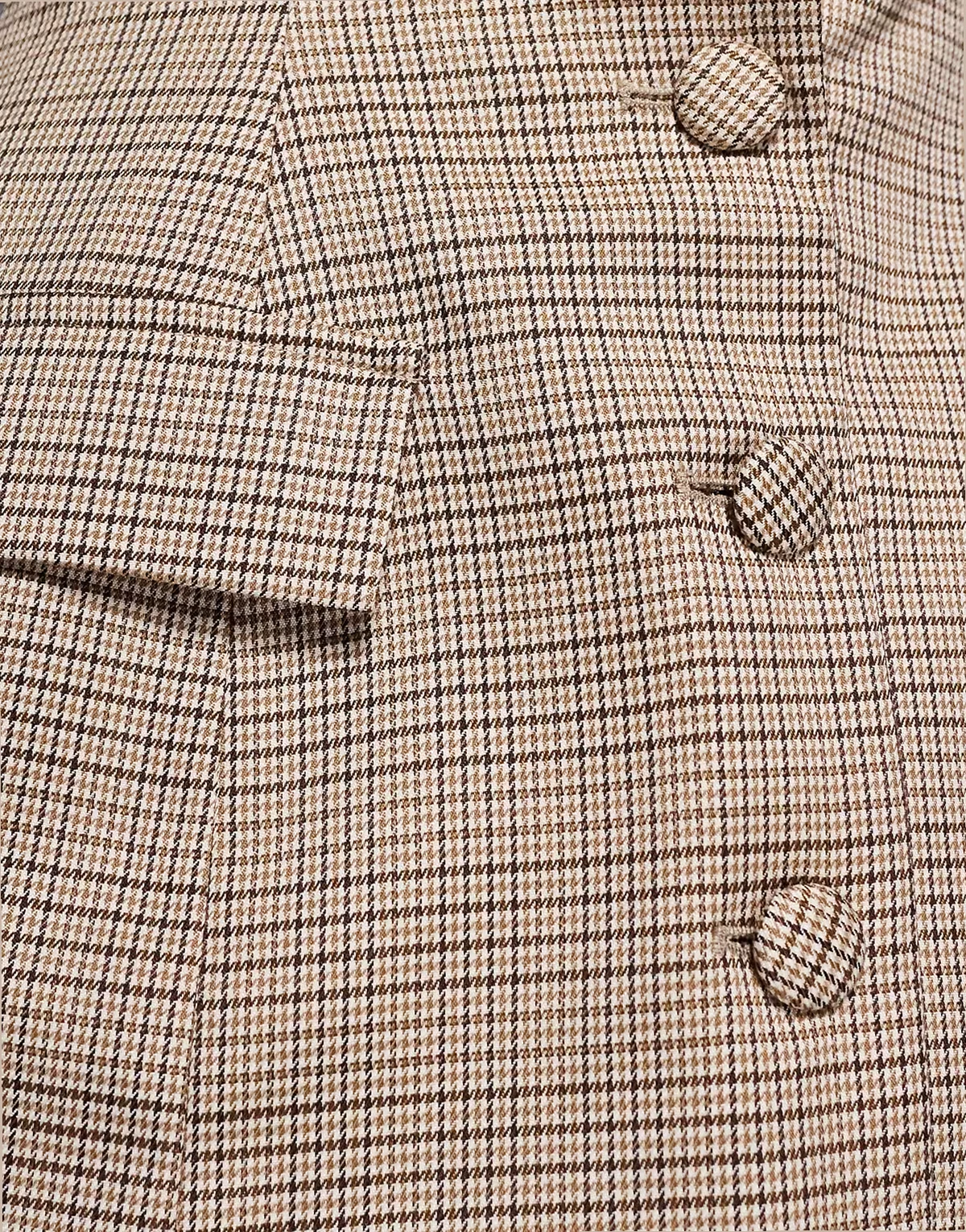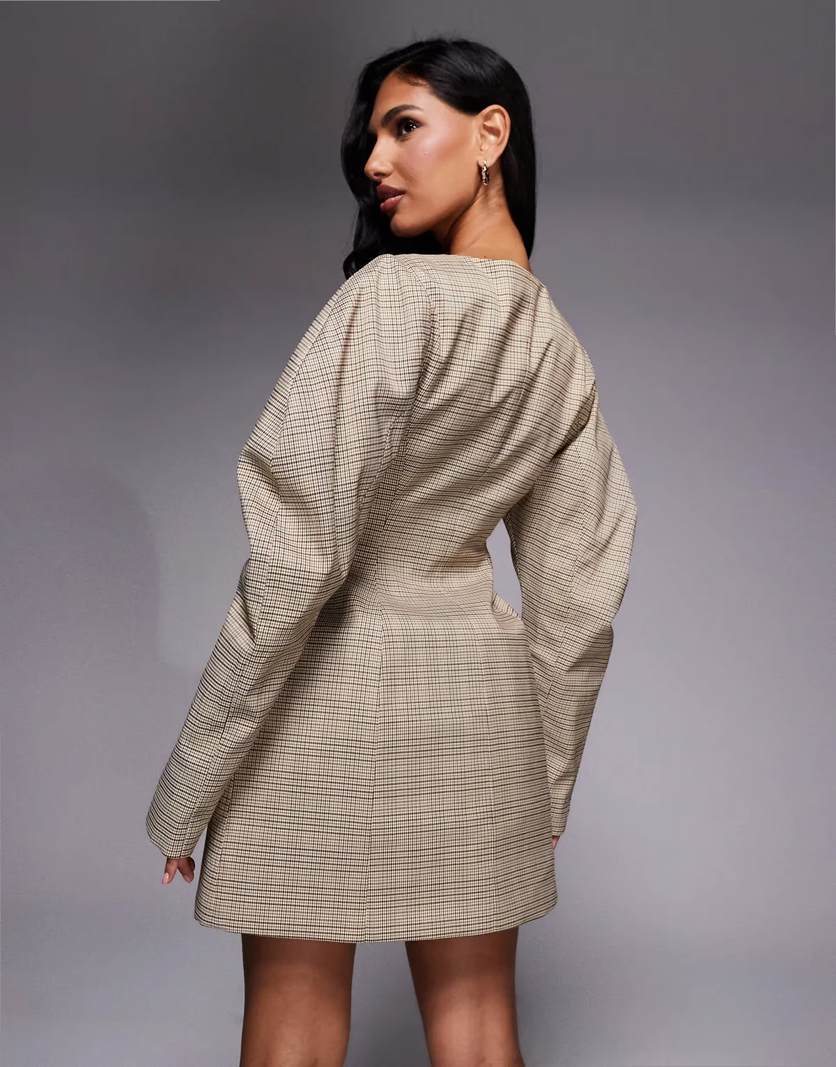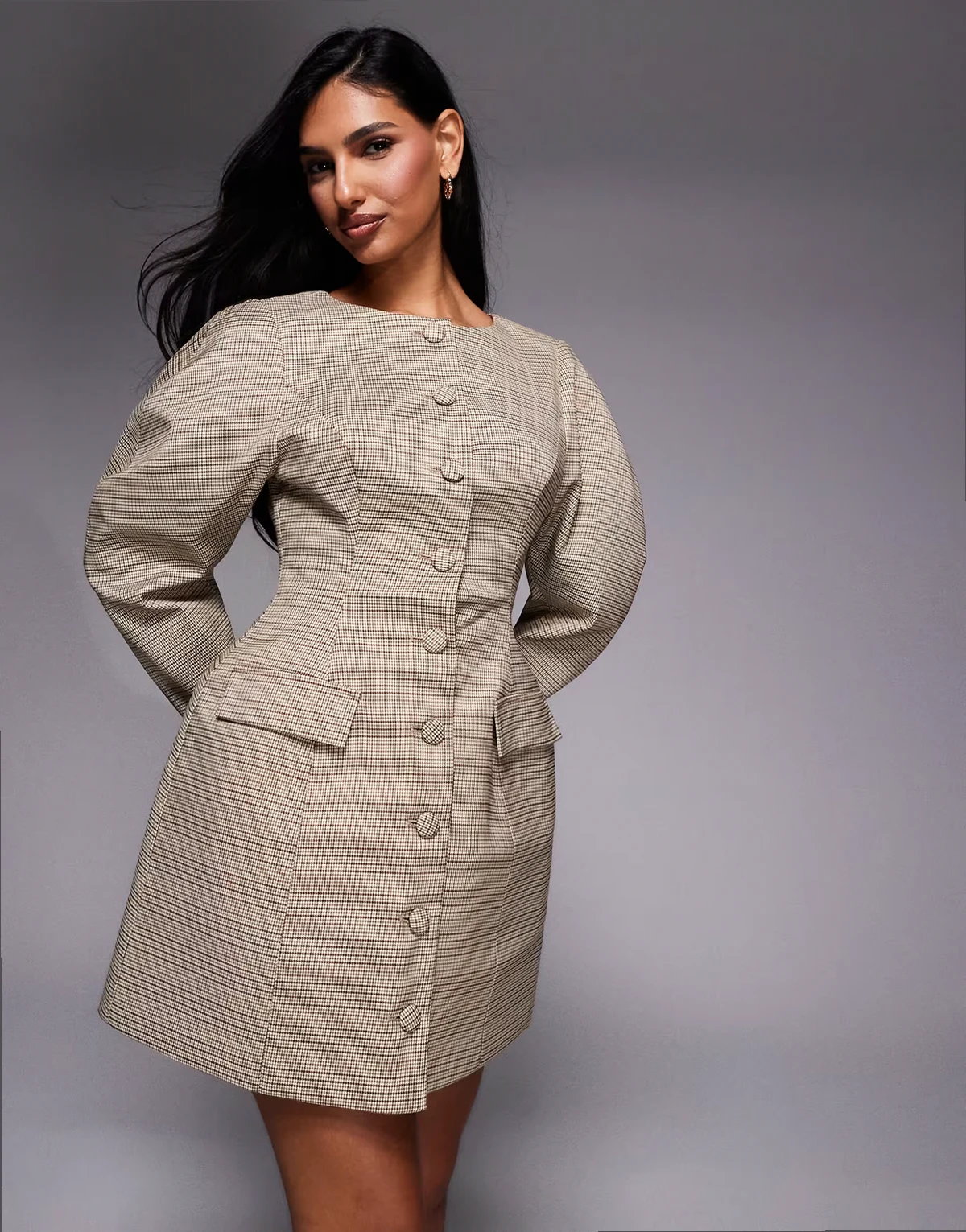 button up sculpted mini dress with cocoon sleeves in brown plaid