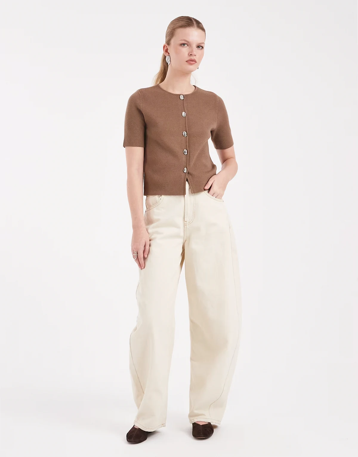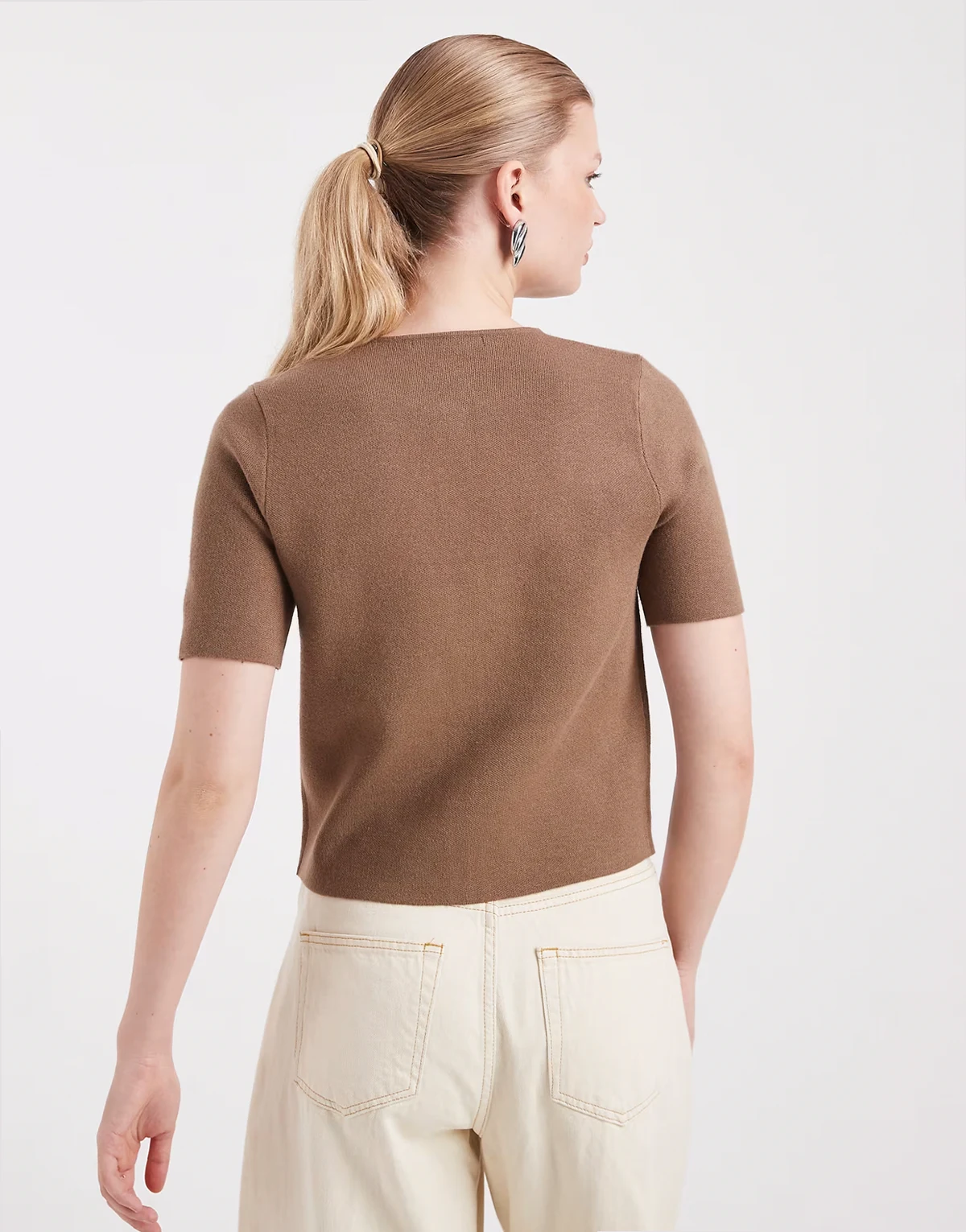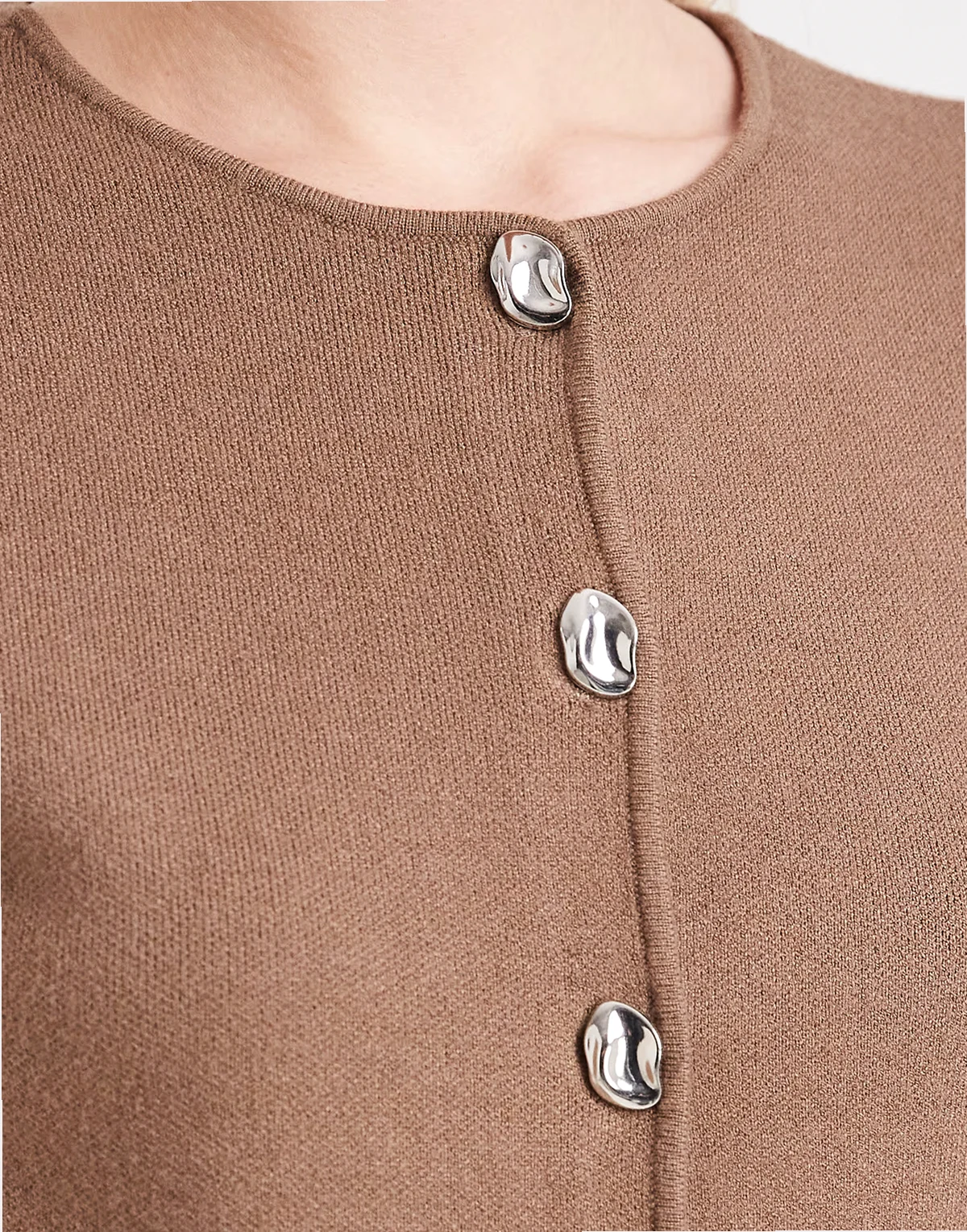 short sleeve compact knit cardigan with contrast buttons in mocha