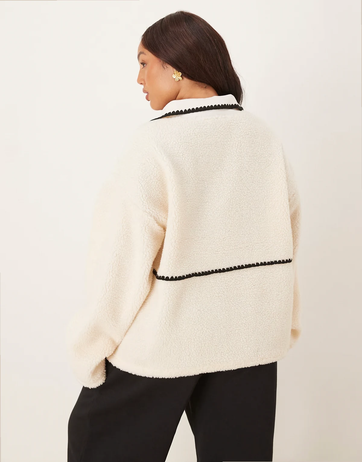 ASOS DESIGN Curve borg fleece pullover sweatshirt with blanket stitch detail in cream and black