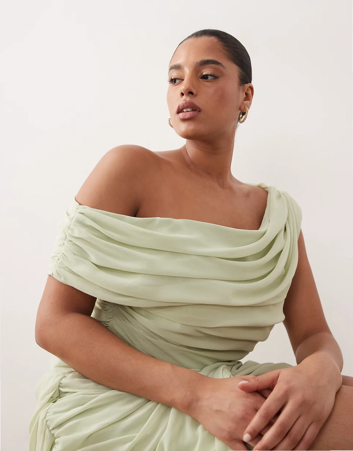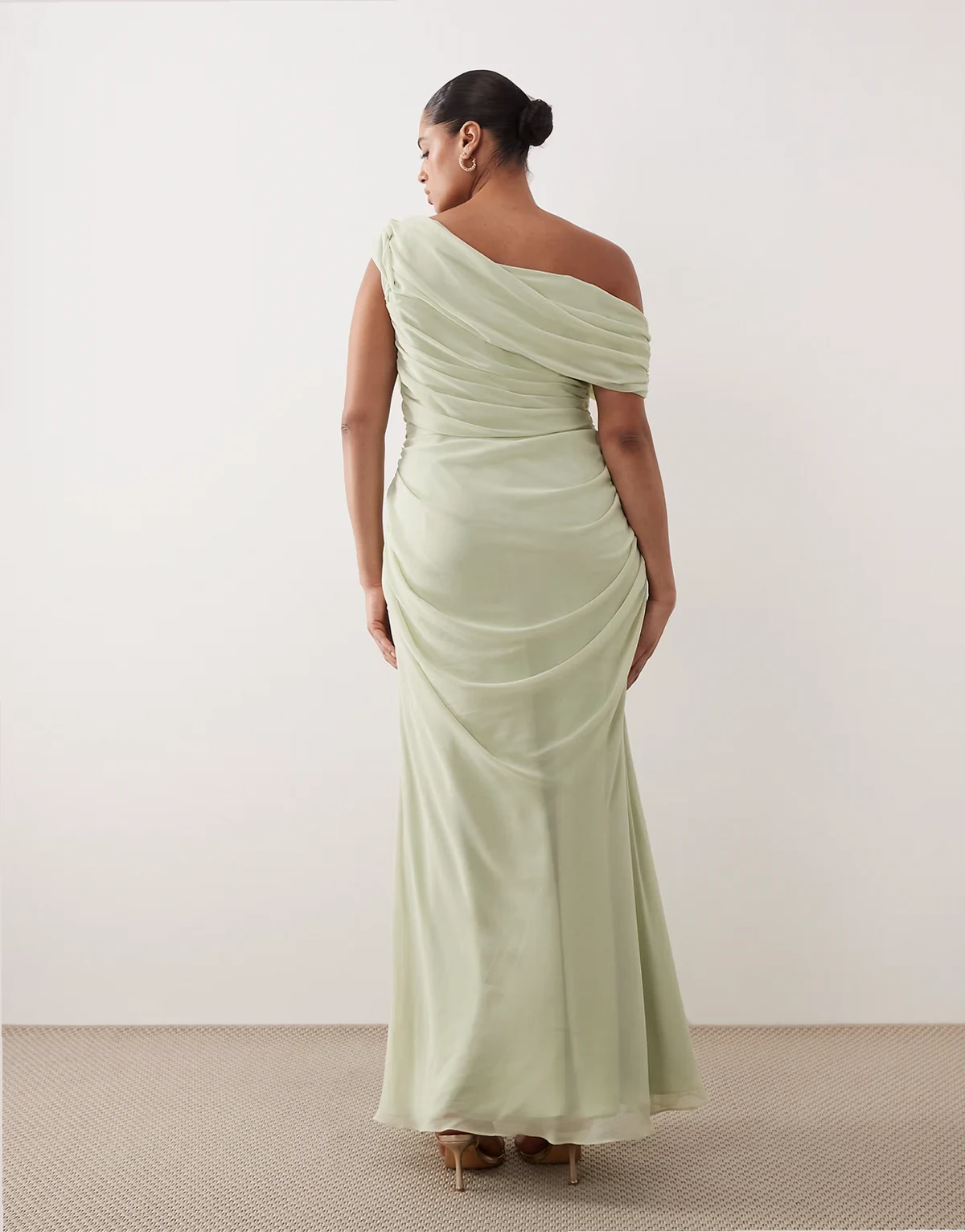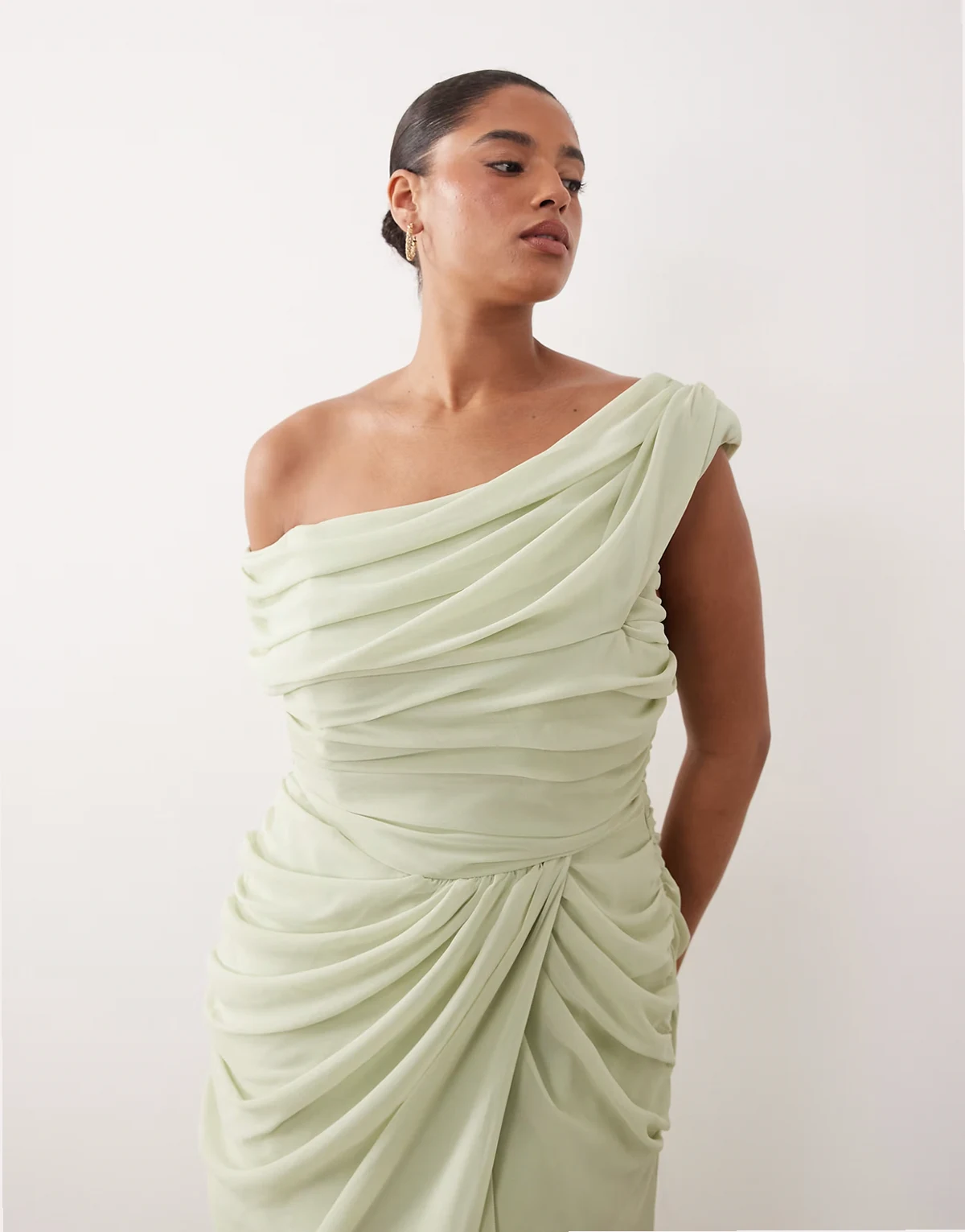 ASOS DESIGN Curve Bridesmaid chiffon draped one-shoulder neckline with fixed wrap skirt in sage green