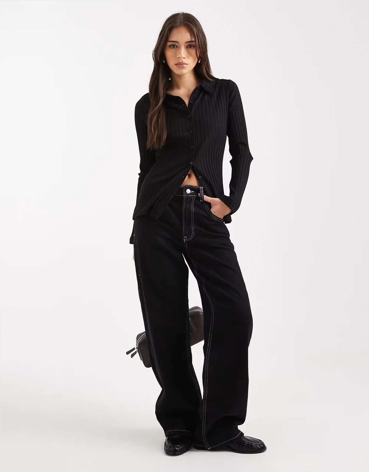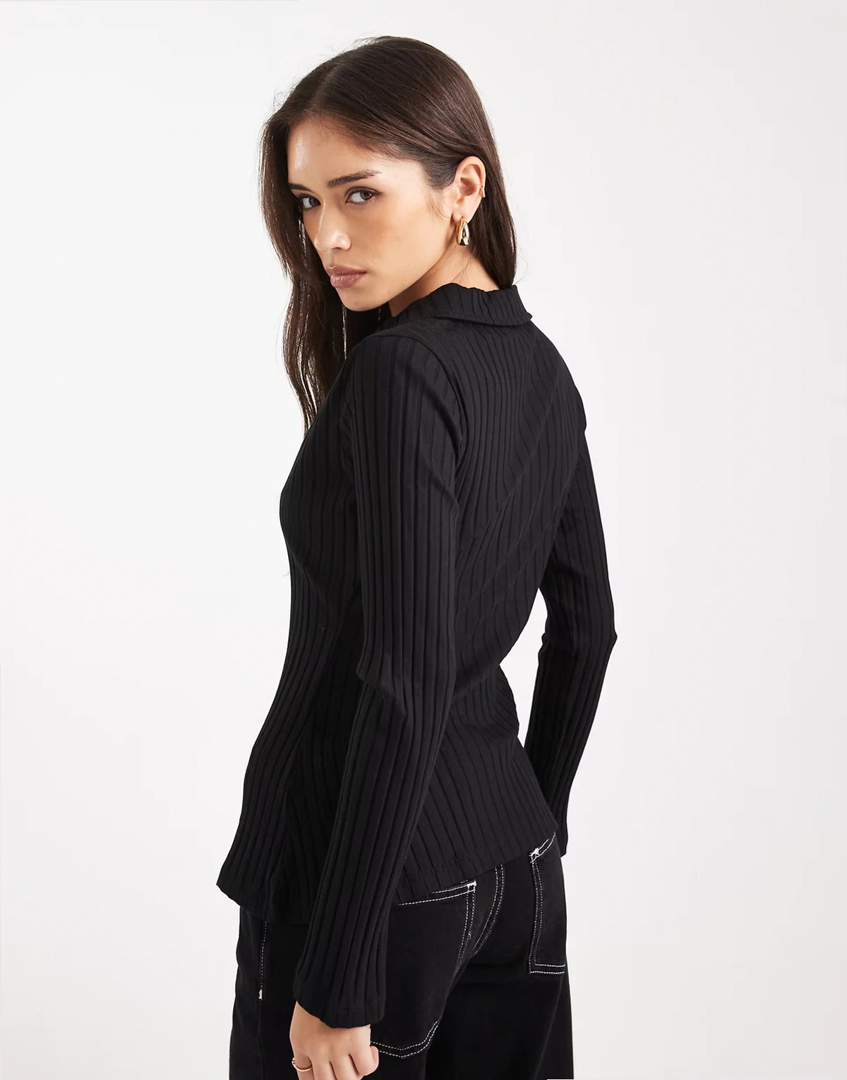 chunky rib knit polo top in black