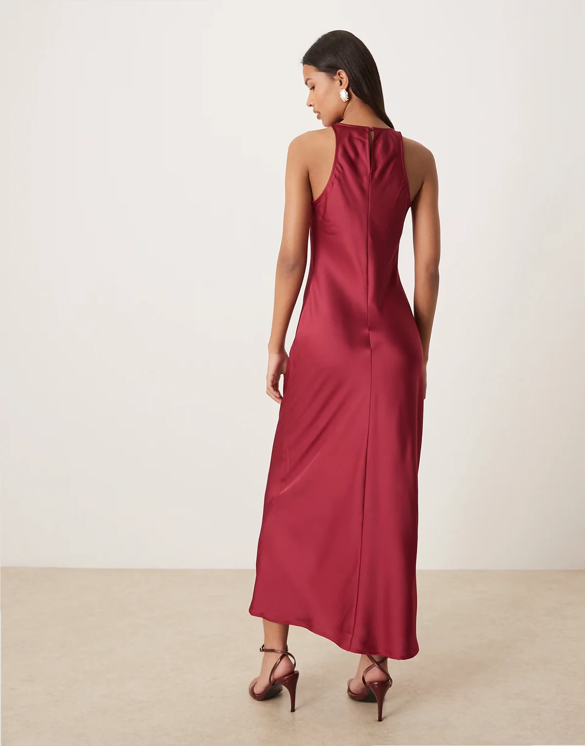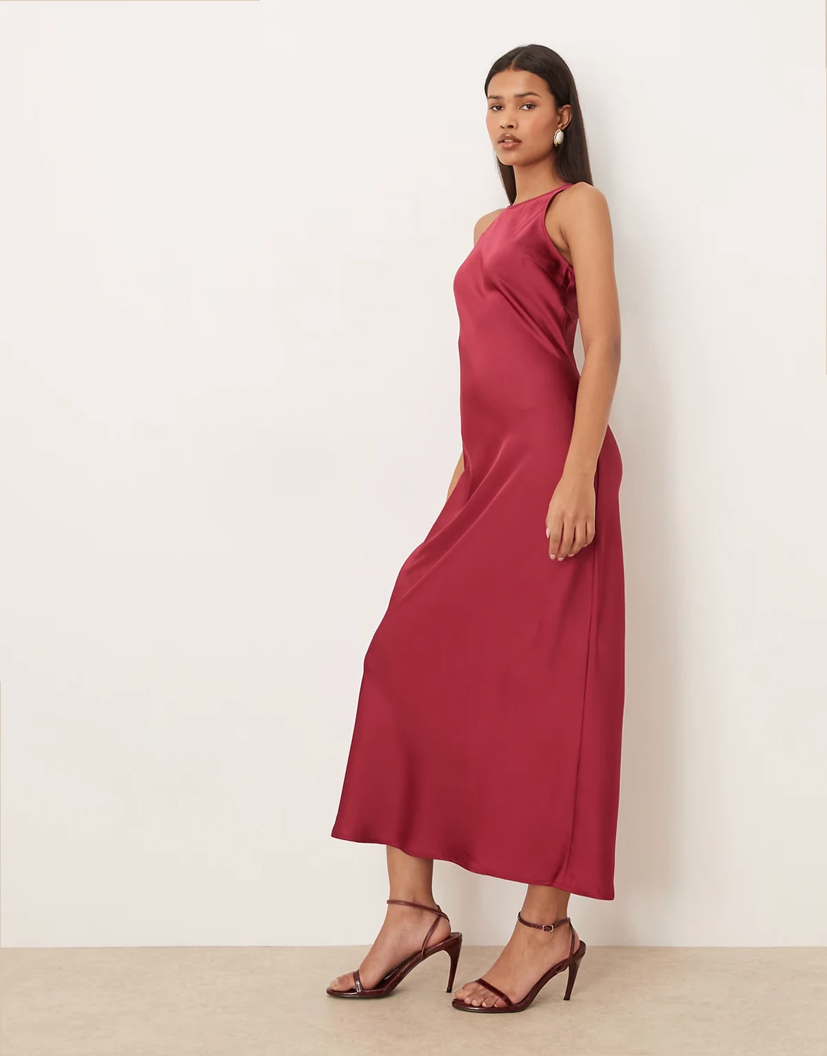 racer neck satin midaxi dress in burgundy