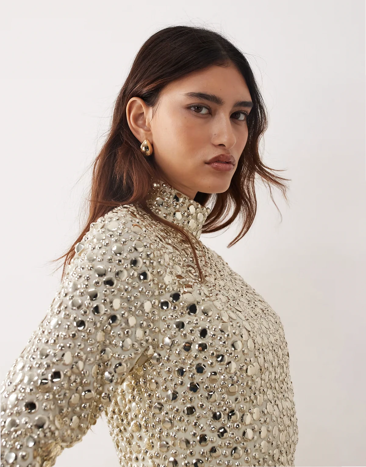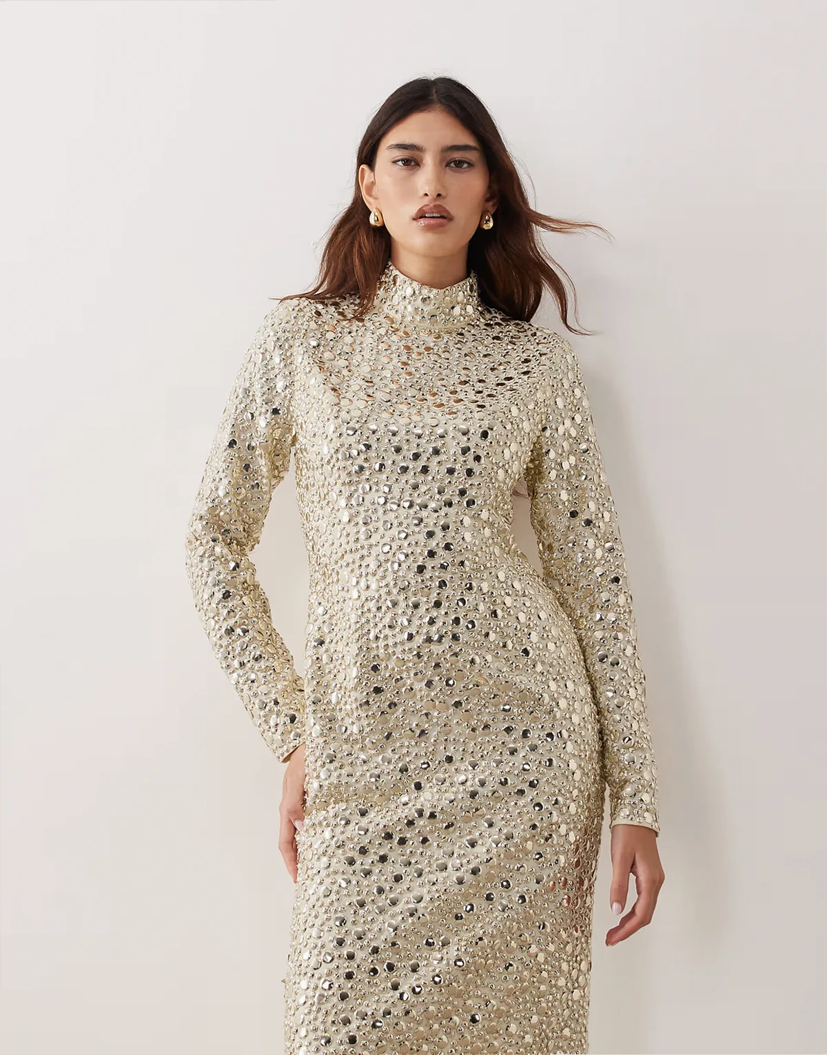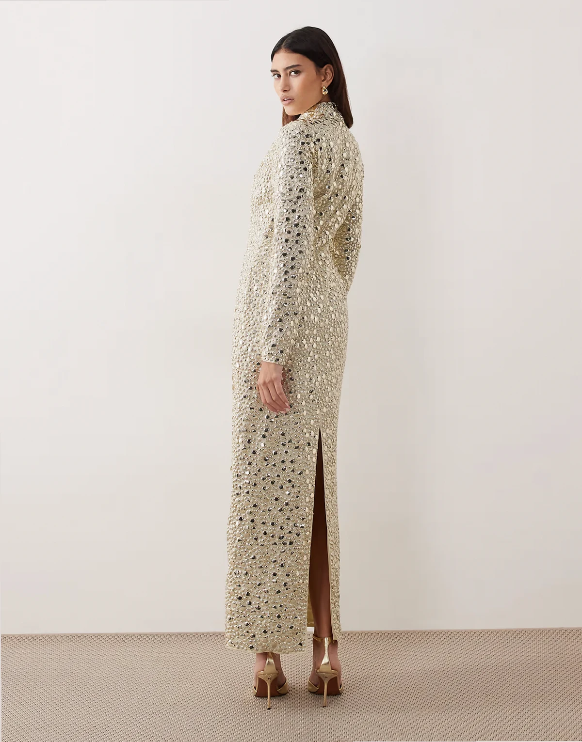 textural sequined high neck long sleeve maxi dress in buttermilk