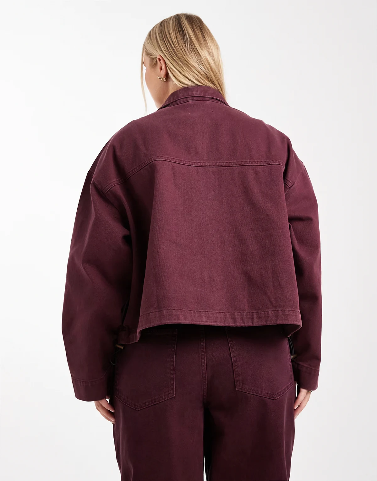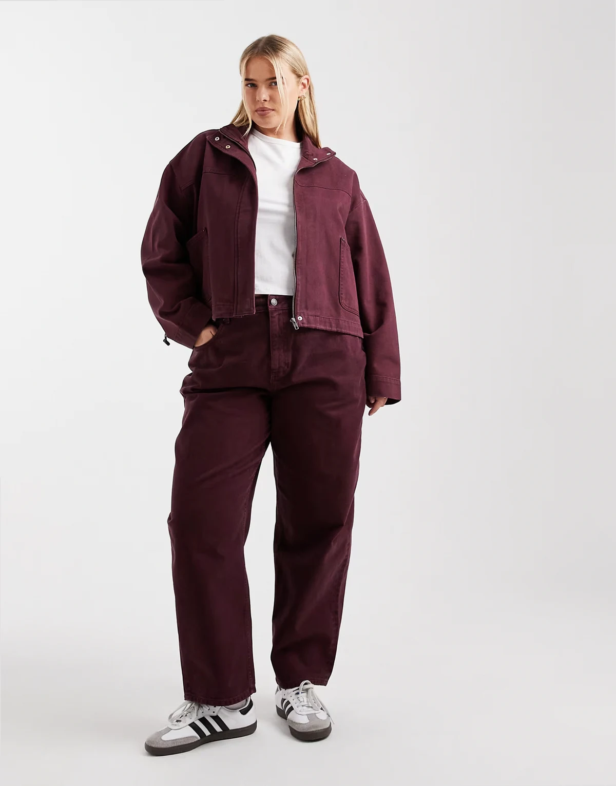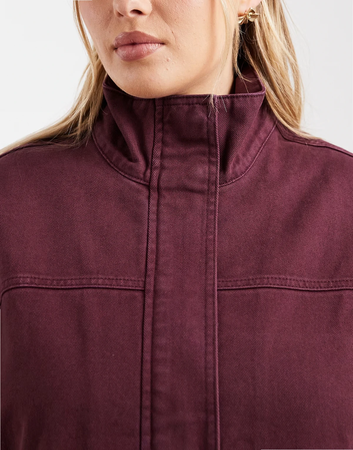 ASOS DESIGN Curve denim funnel neck jacket in burgundy - part of a set