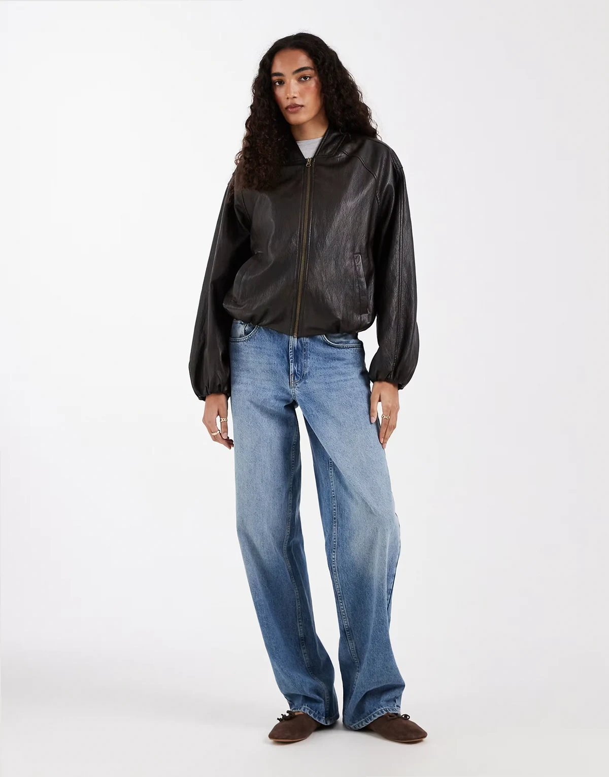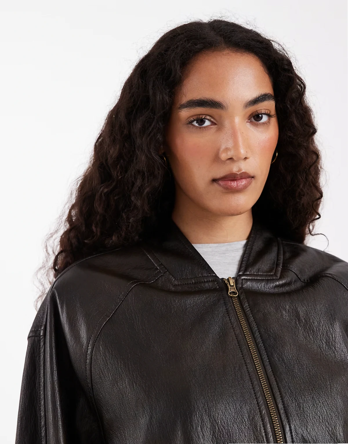 ASOS DESIGN Tall washed leather look oversized bomber jacket in brown