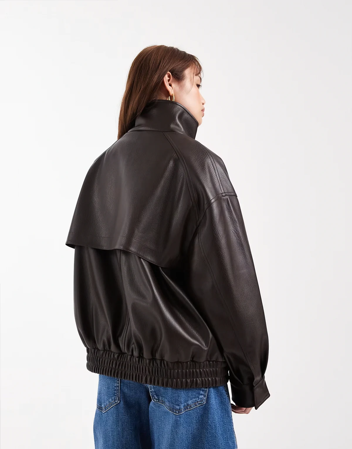 ASOS DESIGN Petite oversized leather look funnel neck bomber jacket in chocolate
