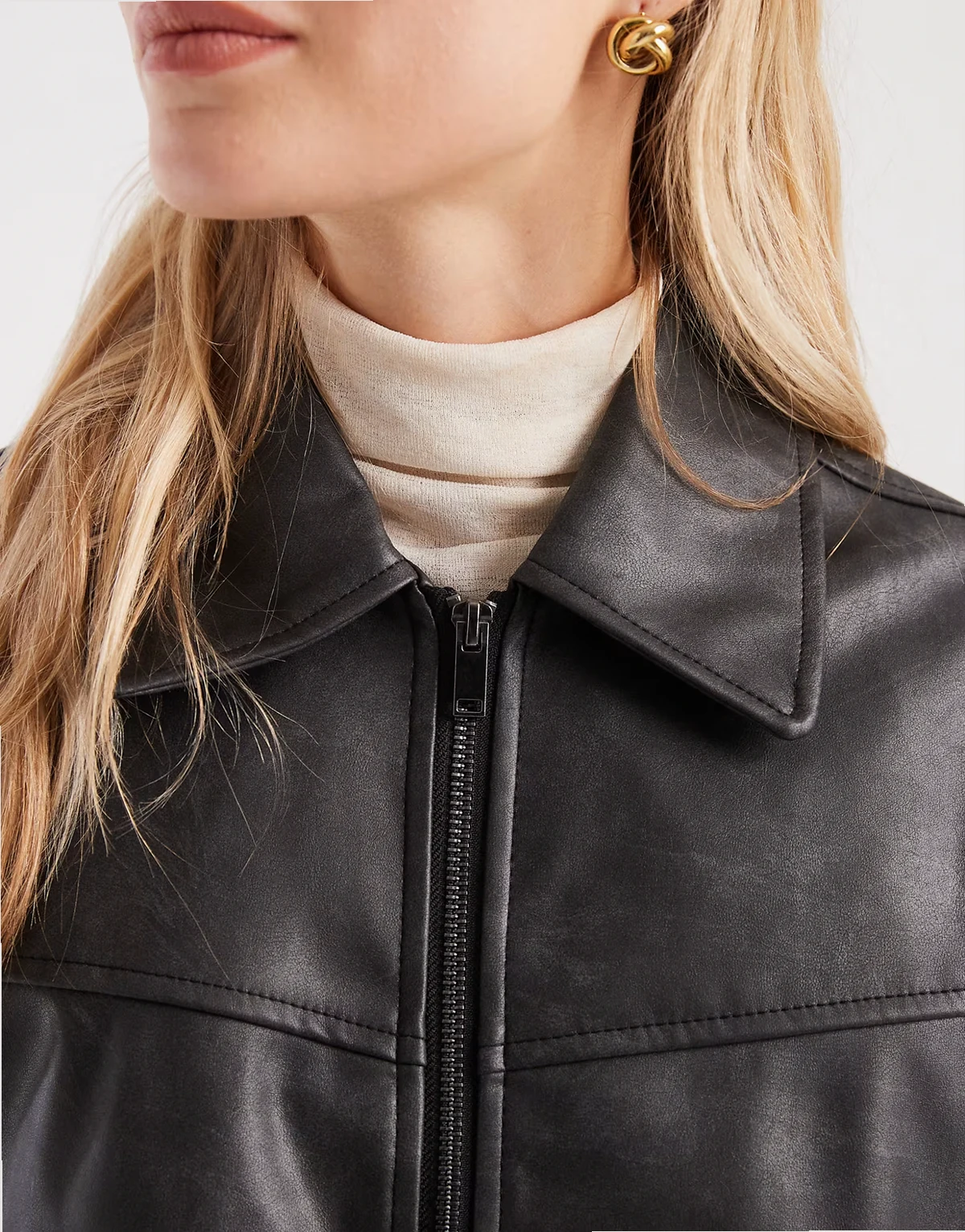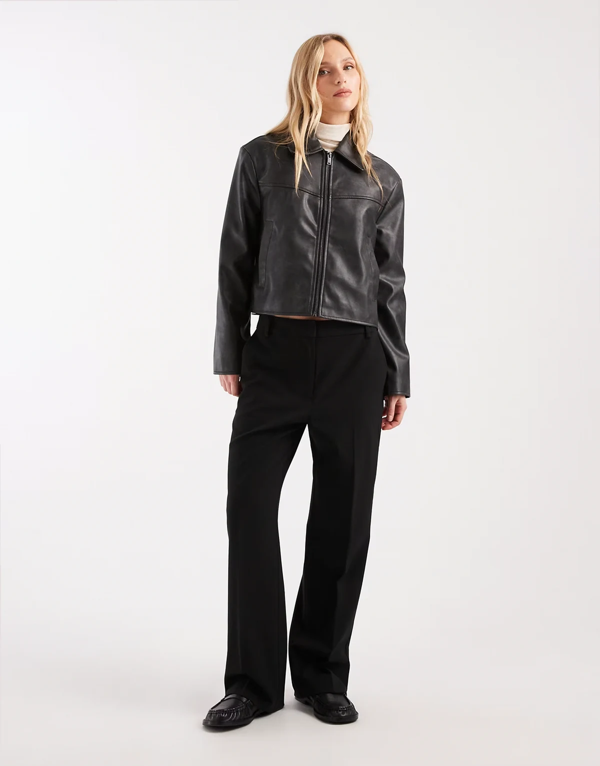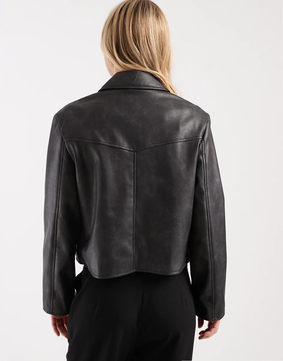 ASOS DESIGN Petite leather look top collar jacket in washed black