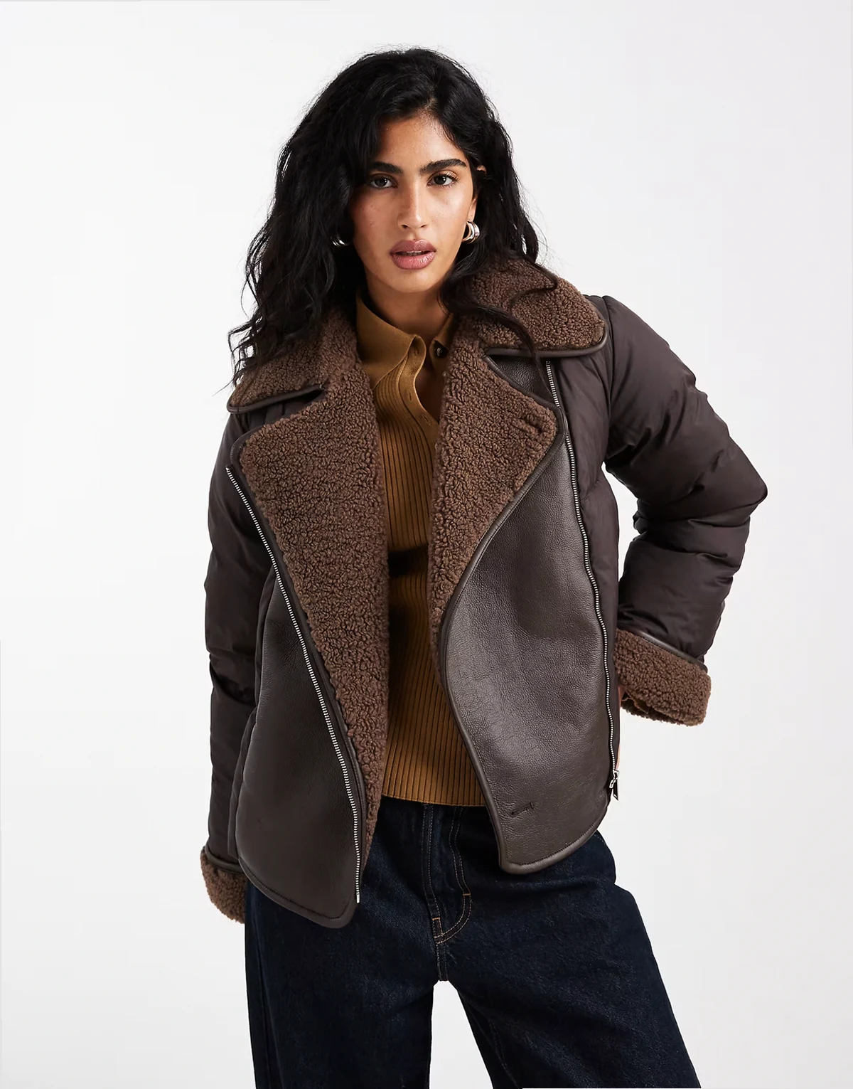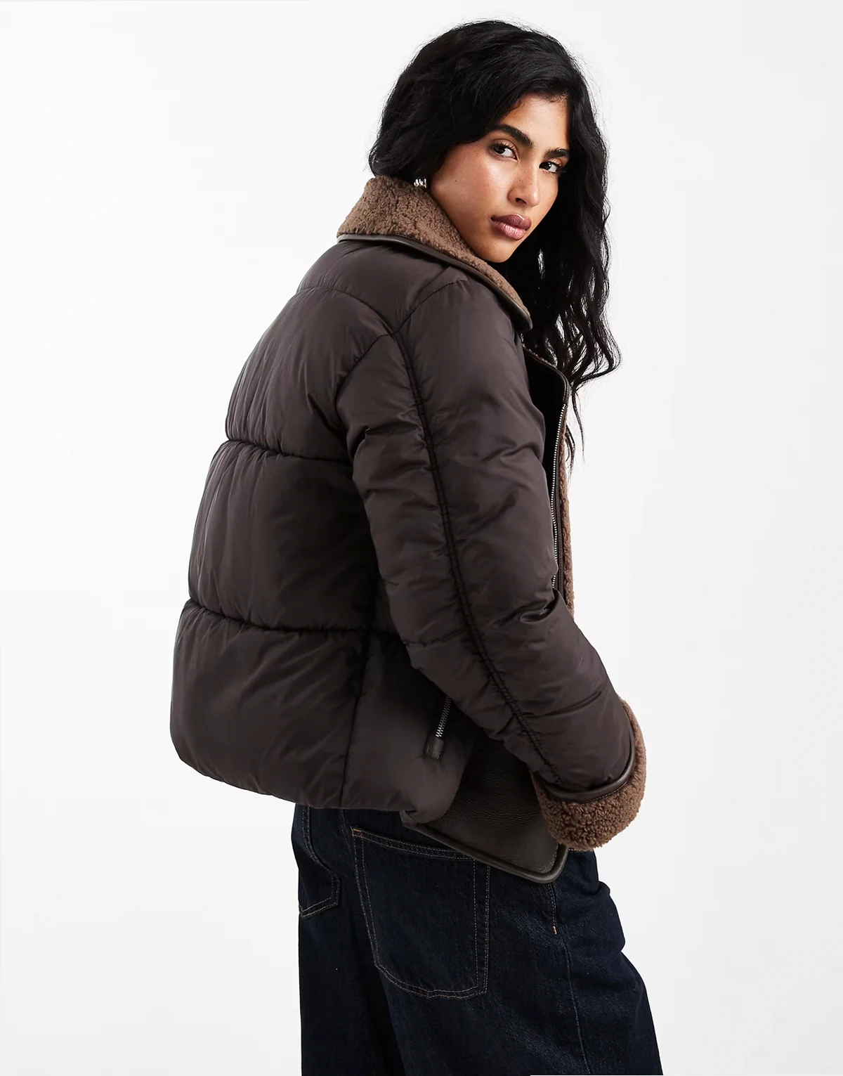 mixed textile short puffer jacket with borg trim in chocolate
