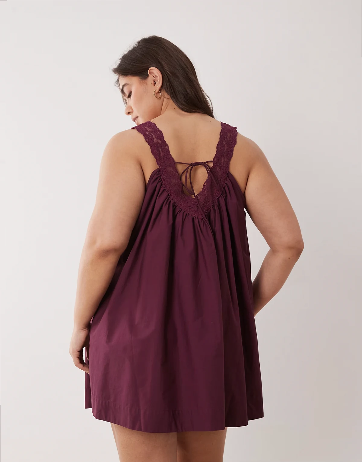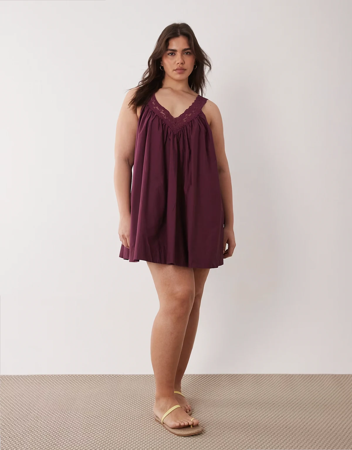 ASOS DESIGN Curve v-neck poplin mini smock sundress with lace overlay in plum wine