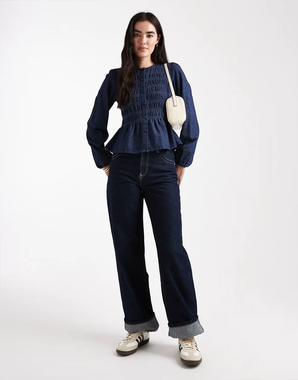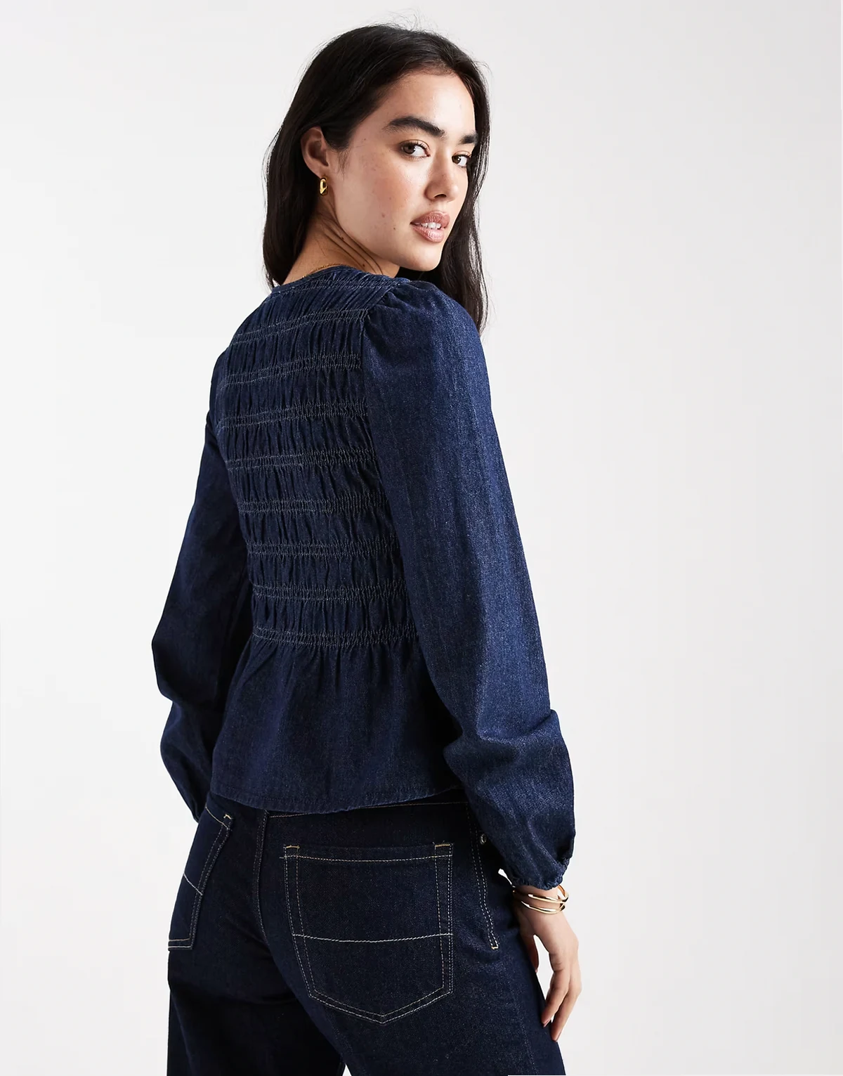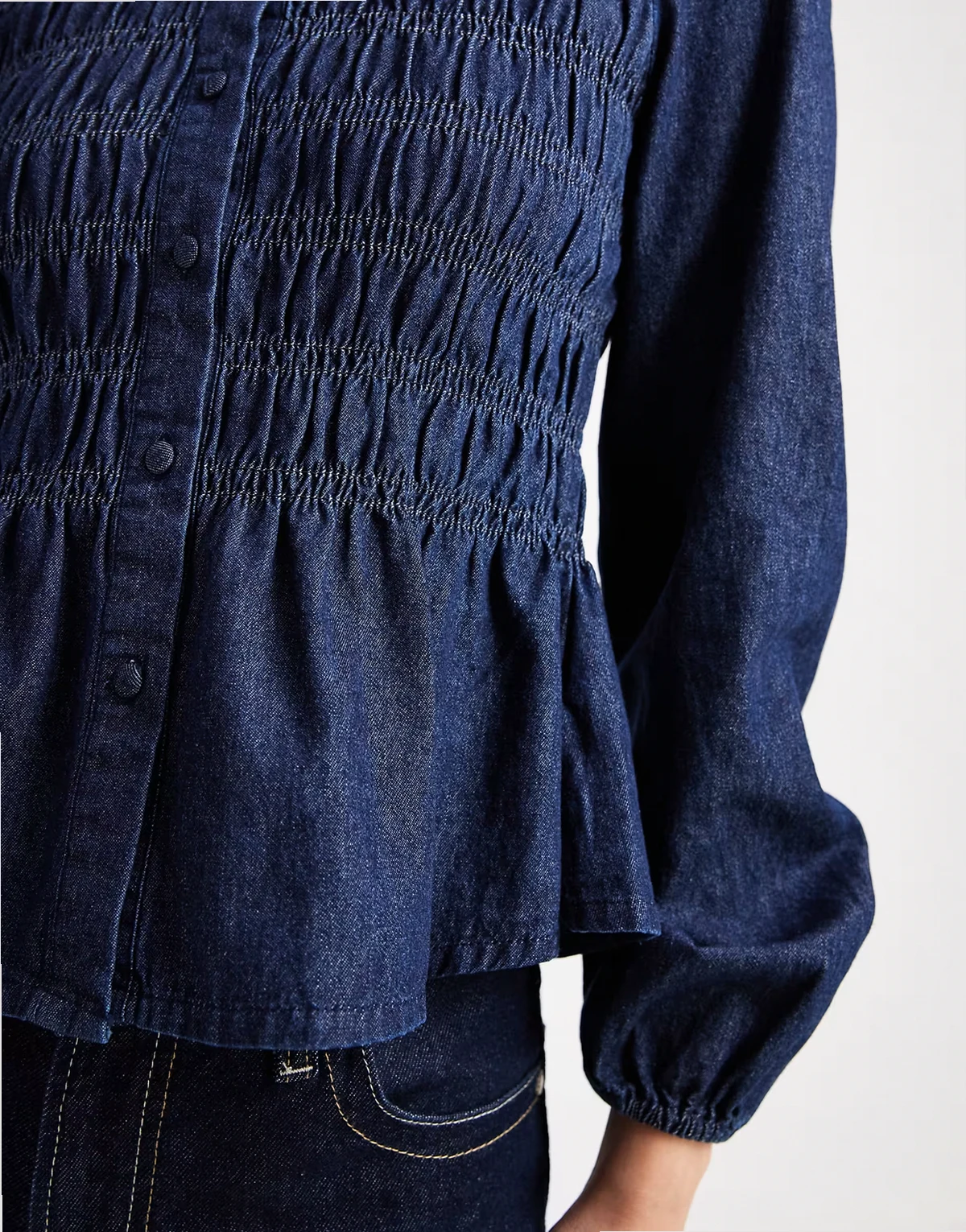 button down denim puff sleeve blouse with shirring in navy
