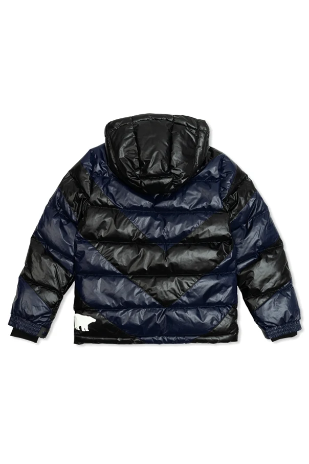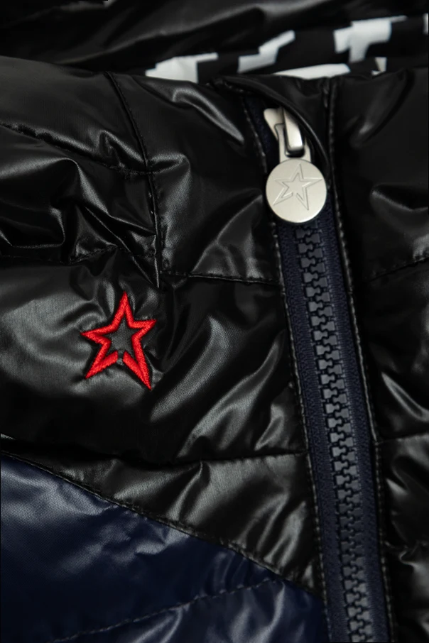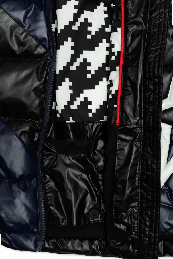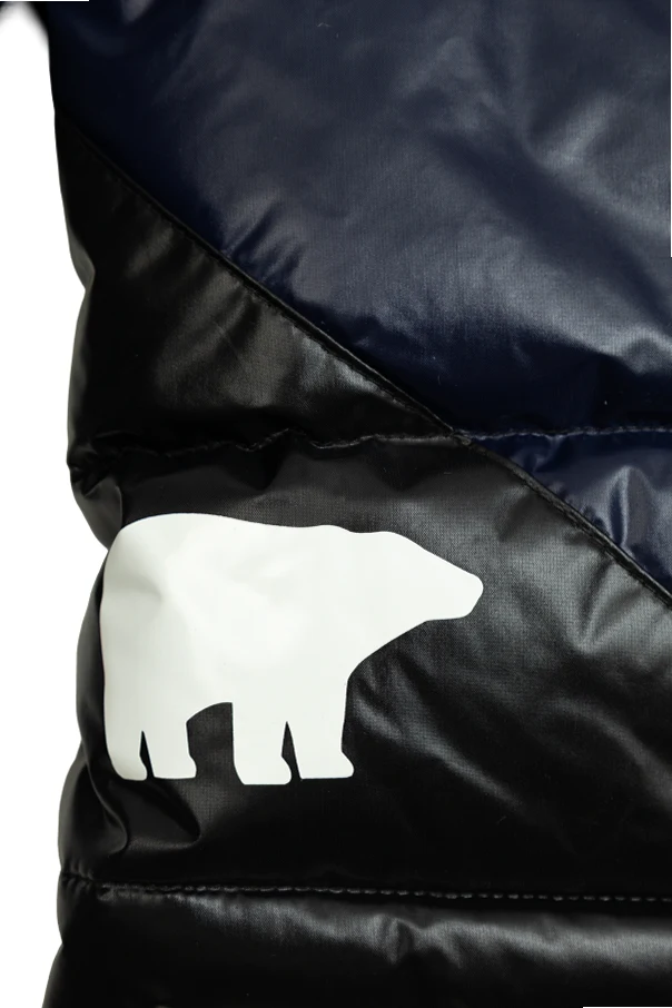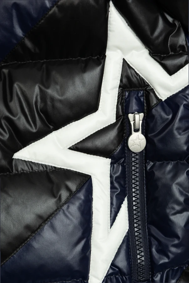 Distinctive horizontal quilting is artfully accented by a bold white star at the front and a charming polar bear silhouette on the back, channeling playful sophistication. The supple polyamide exterior and graphic black-and-white polyester lining enhance both function and visual appeal, while premium natural down fill ensures outstanding thermal protection—ideal for both the slopes and urban escapades.