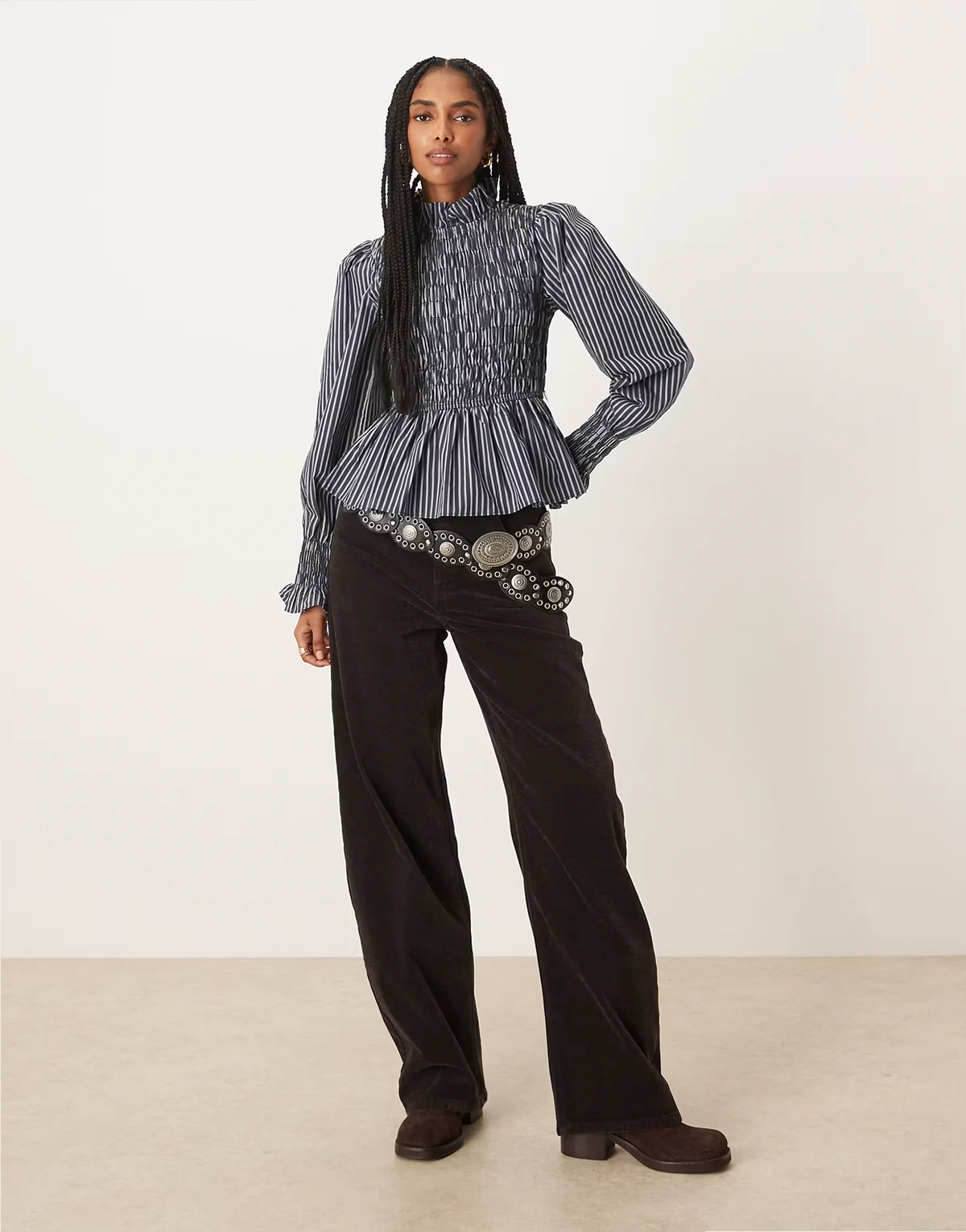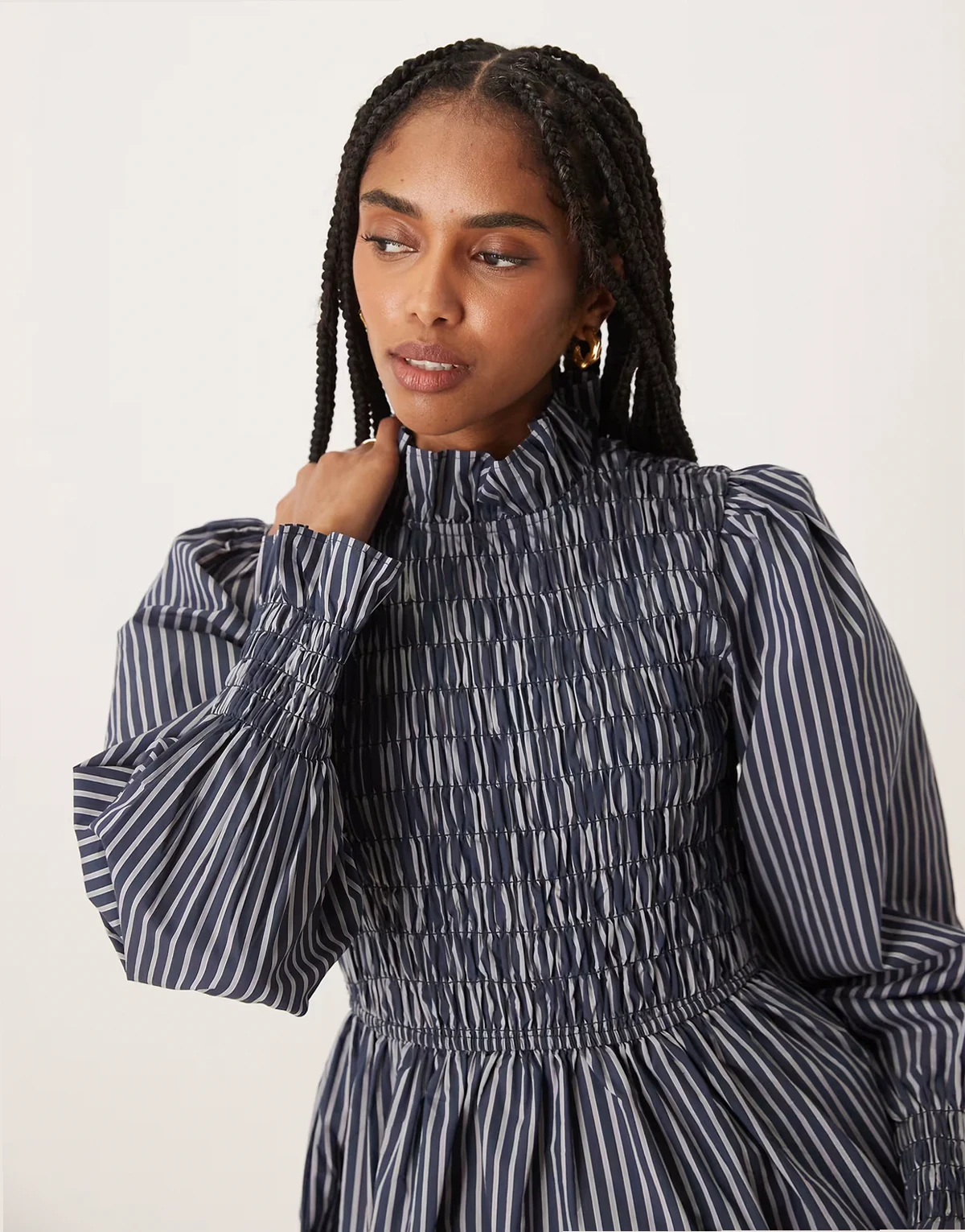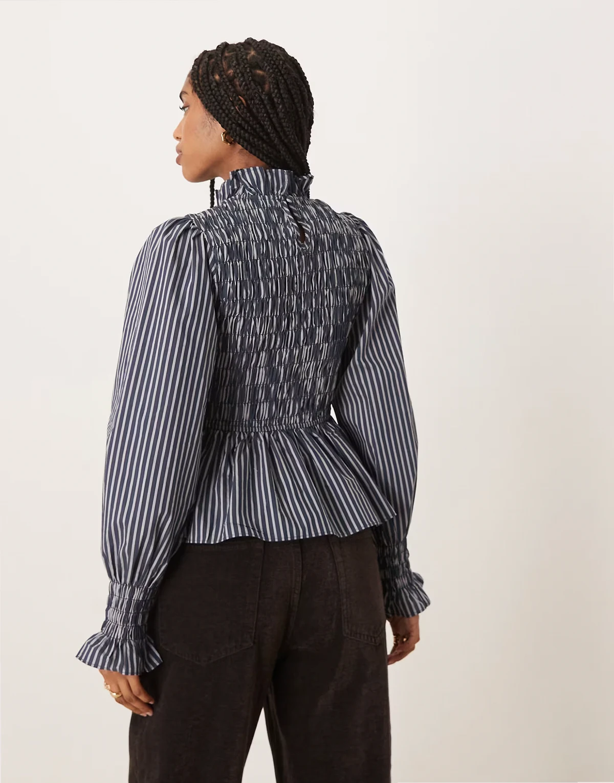 ruffle neck shirred body long sleeve blouse in navy blue stripe
