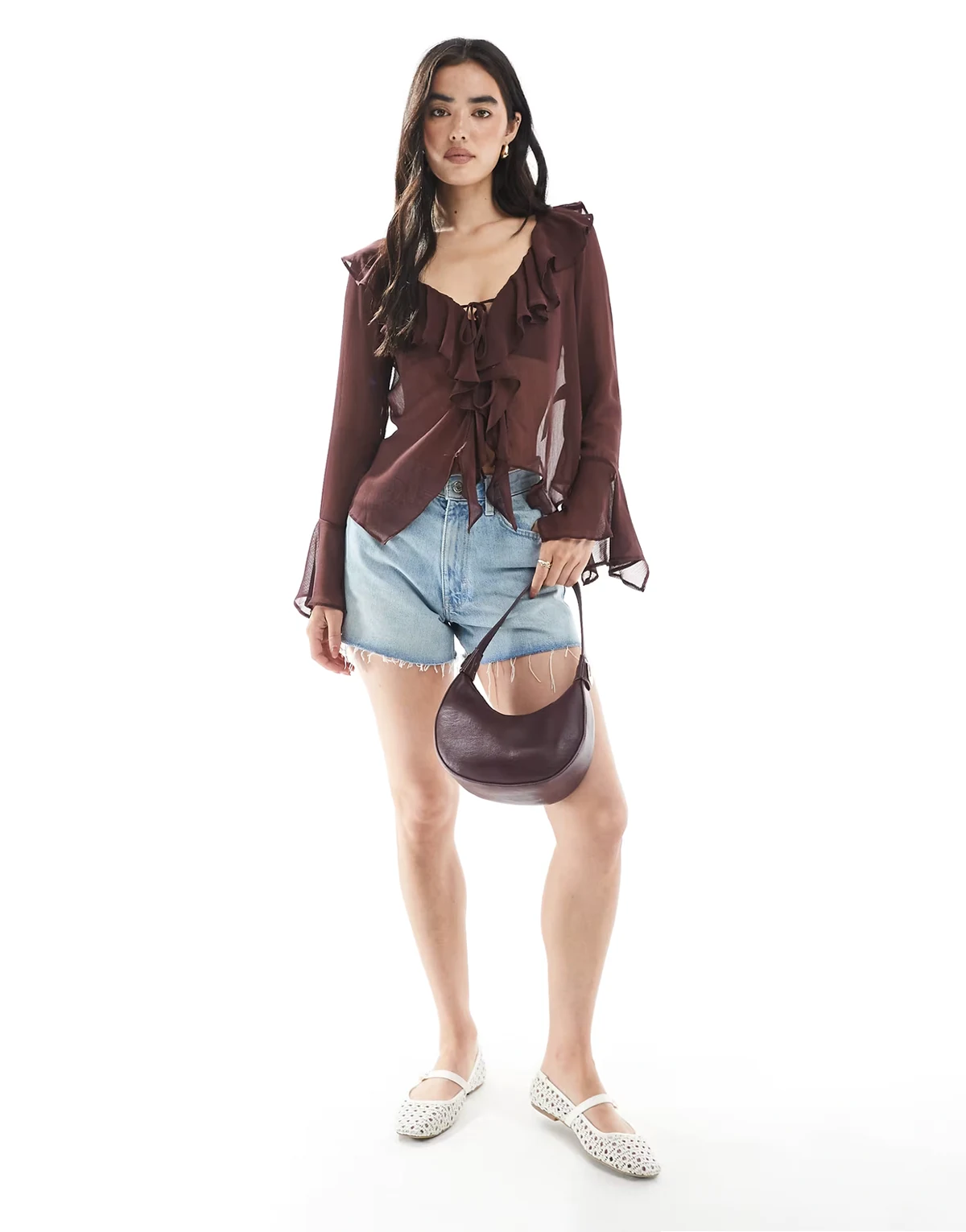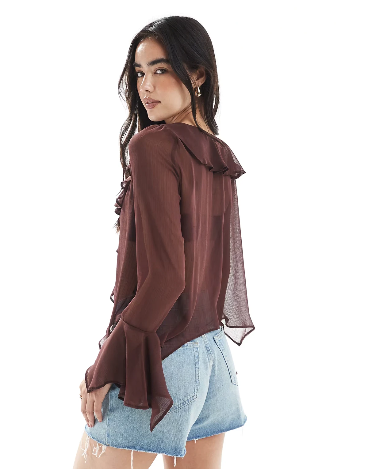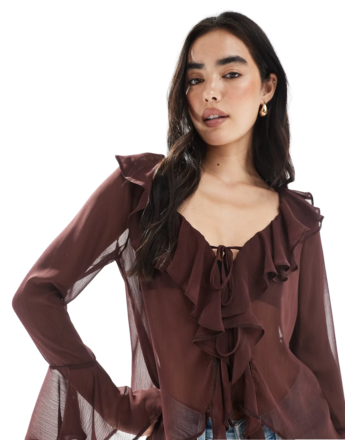 chiffon ruffle tie front top in brown