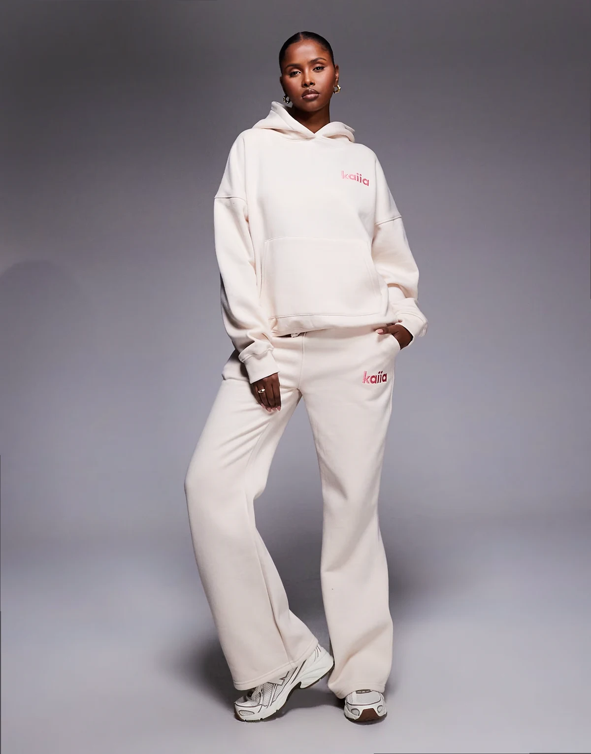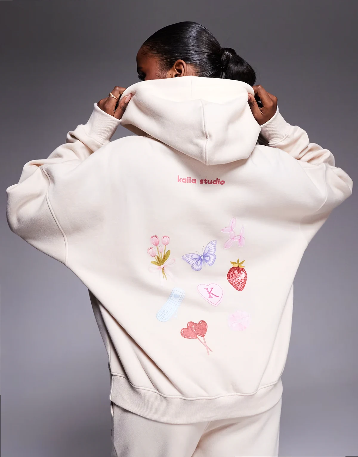 embroidered logo sweethearts sticker back graphic oversized hoodie in cream - part of a set