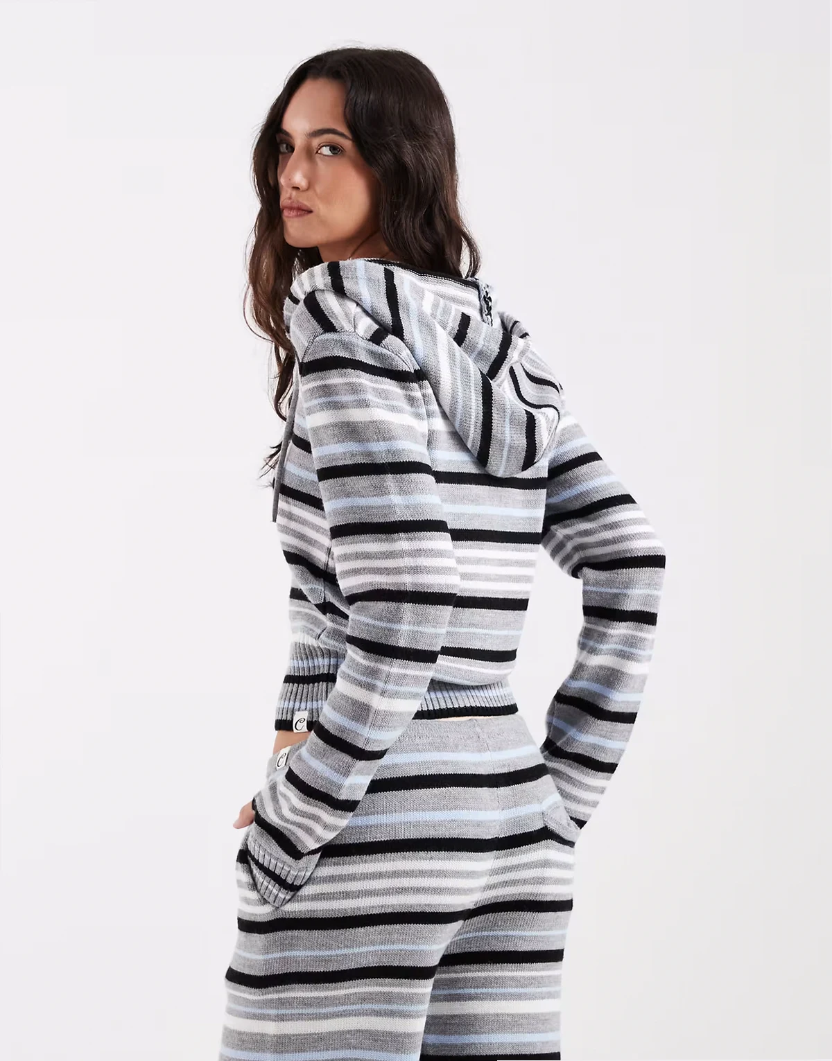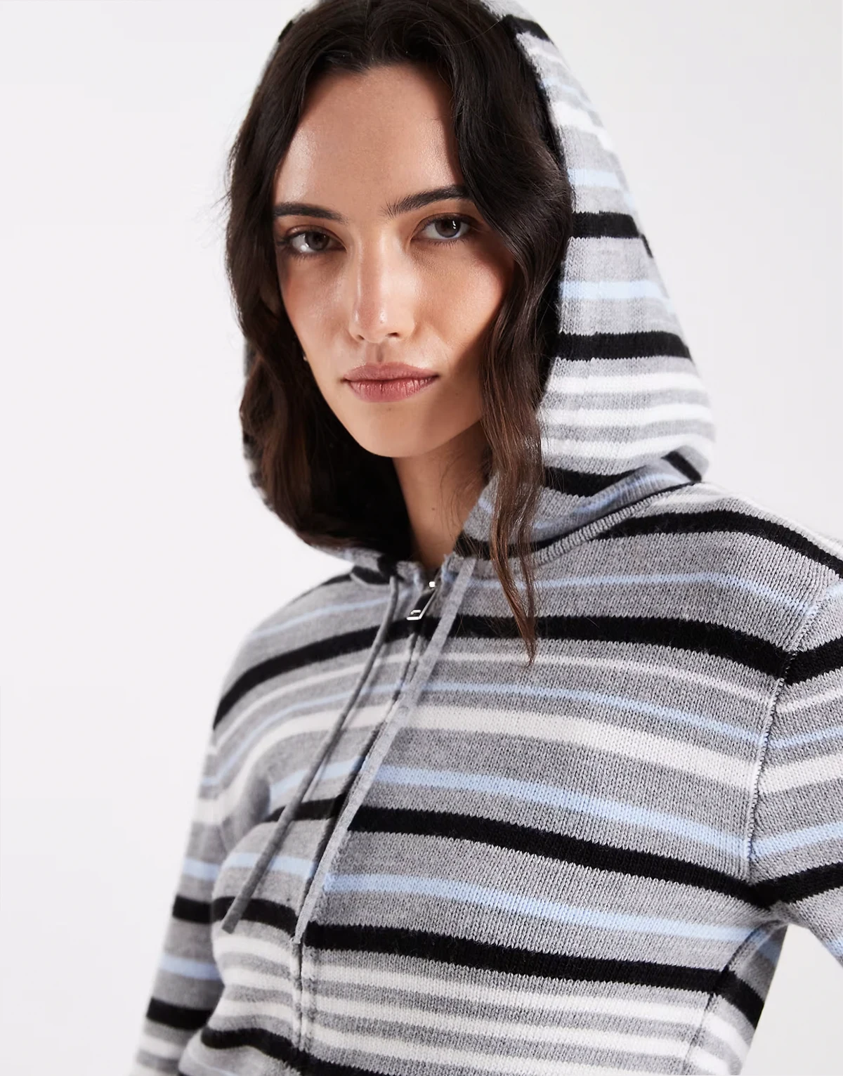 stripe knit zip through hoodie in gray and blue